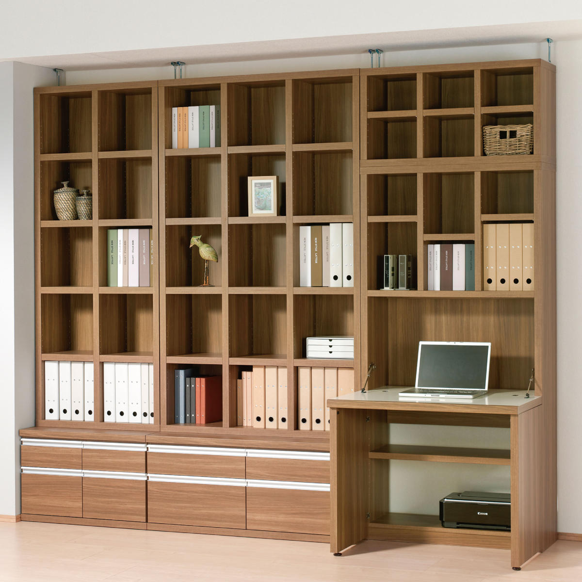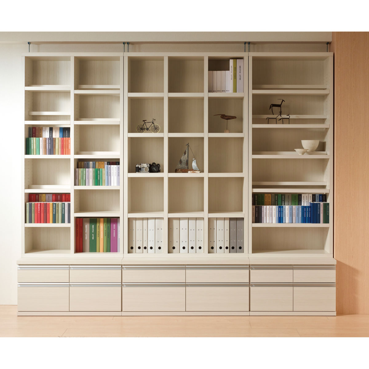 高さを調節できる可動棚付きで、ムダなく収納していただけます。棚板を等間隔に付けた際、A4ファイルの5段3列収納が可能です。