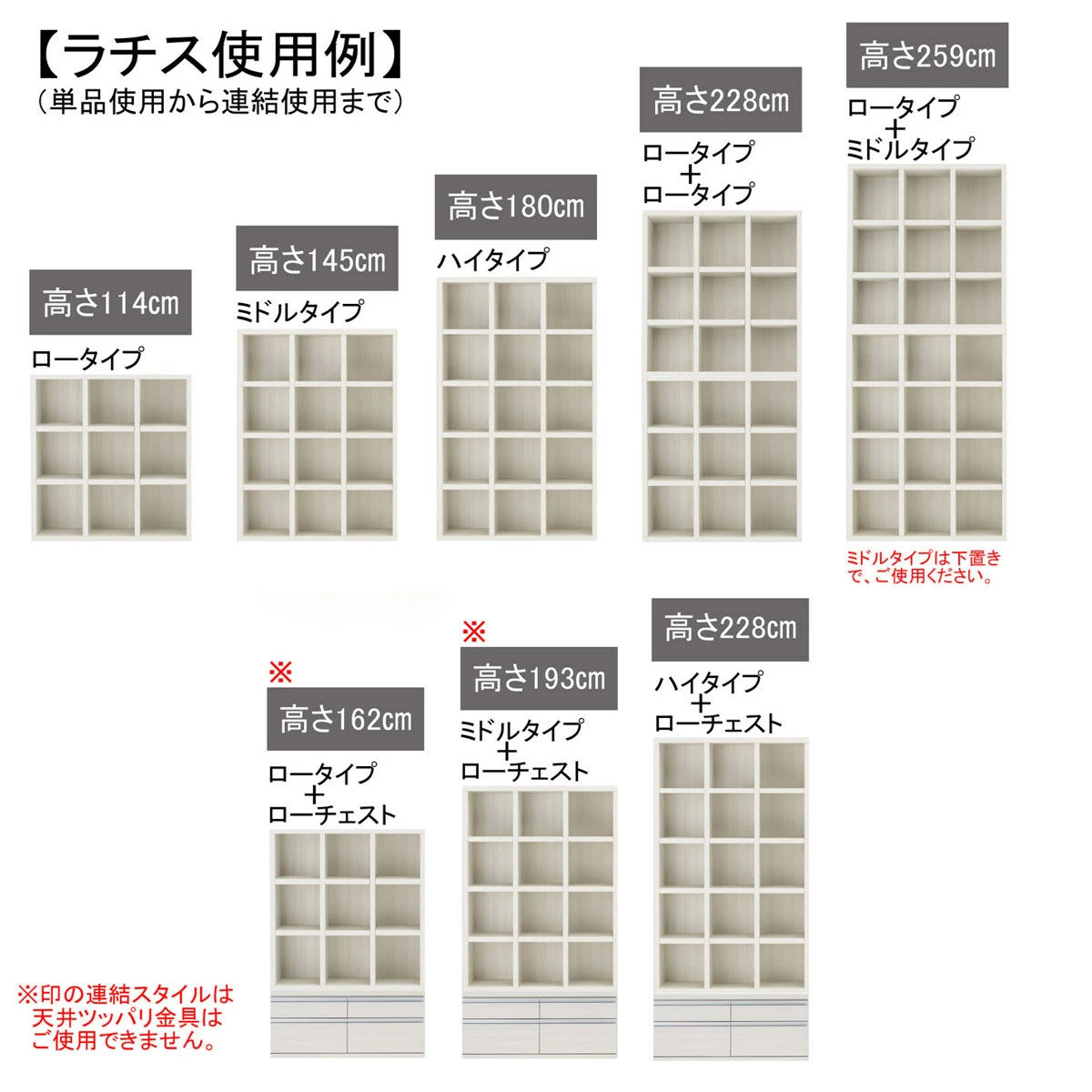 単品使用やミドルタイプ同士で並べたり、ロ―タイプを上に設置したり、ローチェストの上に設置ができます。お部屋に合わせて別売りアイテムと組み合わせて、レイアウトをお楽しみください。
