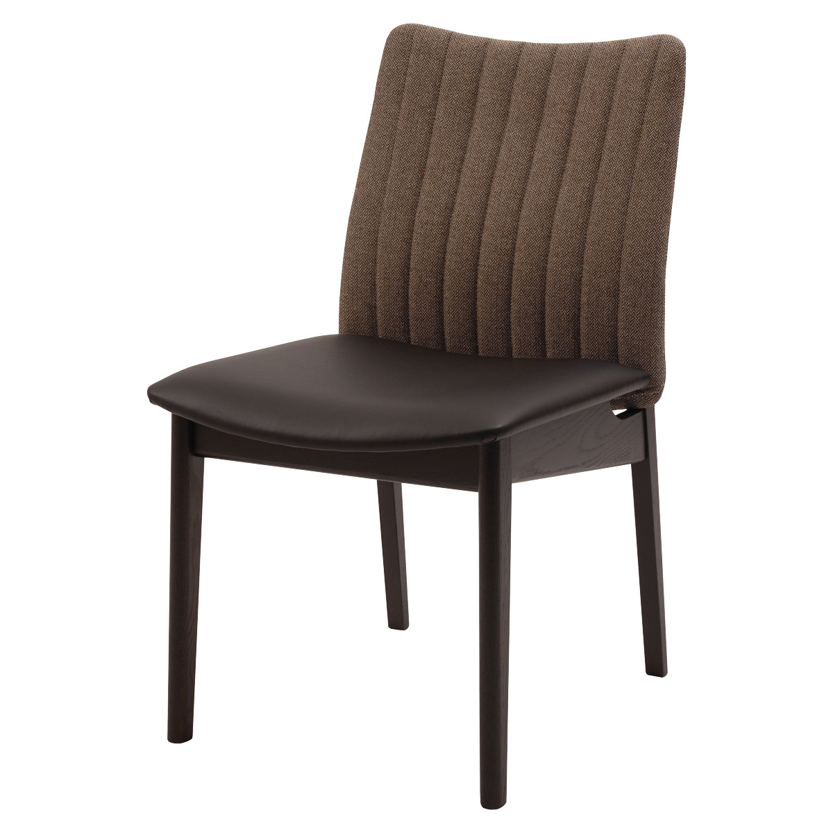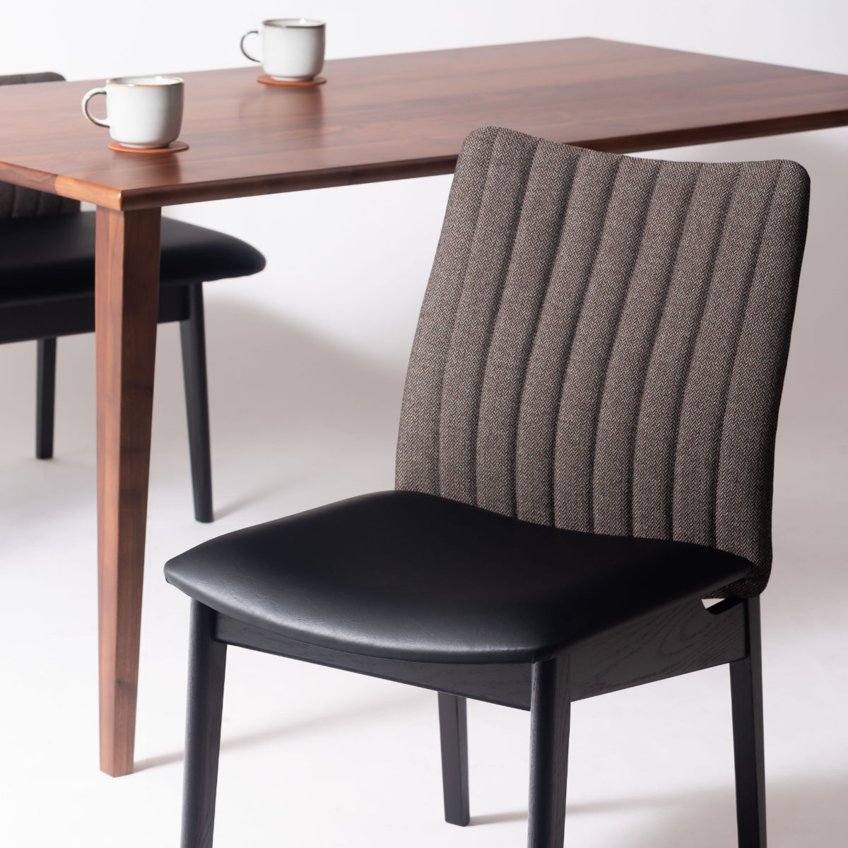 座り心地とデザイン性を兼ね備えたダイニングチェアです。ファブリックに合皮、そして天然木の異素材の調和が美しく、気品に満ちた佇まいが落ち着きある空間にしてくれます。細かなところまで丁寧に仕上げた日本製で、日本のものづくり力を体感できます。