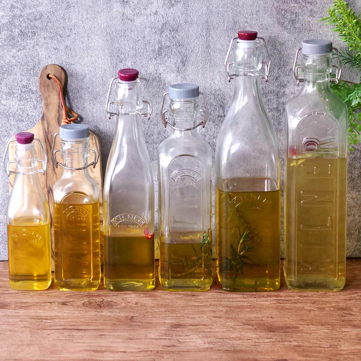 KILNERの保存ボトルは、食材や用途に合わせて選べる使いやすいサイズ展開です。単体での使用はもちろん、種類別で複数使いすれば、キッチンが整って統一した空間が生まれます。透明で中身が一目で分かるので、複数並べても使いたい時にすぐに手に取れます。