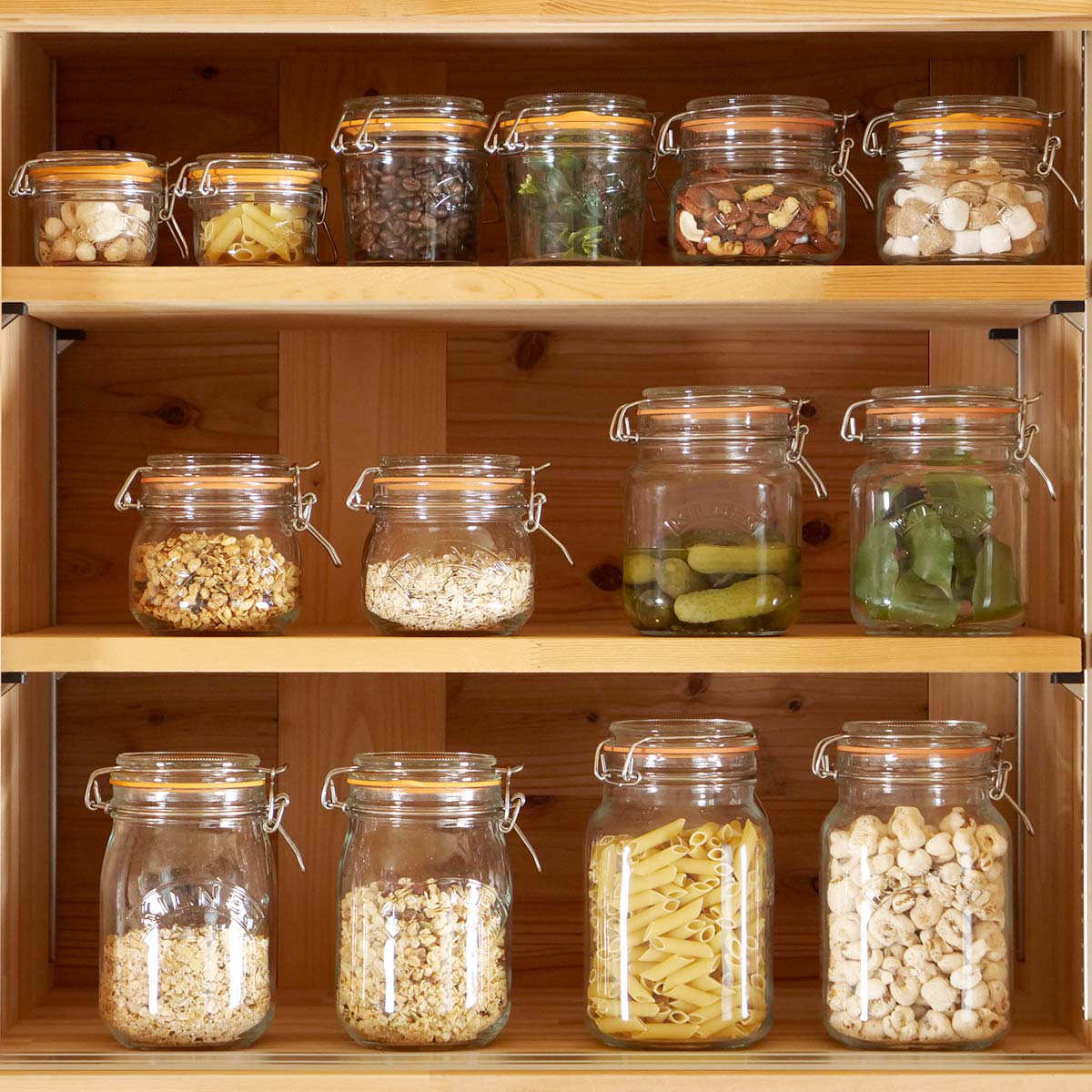 KILNERの保存瓶は、食材や用途に合わせて選べる豊富なサイズ展開です。単体での使用はもちろん、種類別で複数使いすれば、キッチンが整って統一した空間が生まれます。透明で中身が一目で分かるので、複数を並べても使いたい時にすぐに手に取れます。