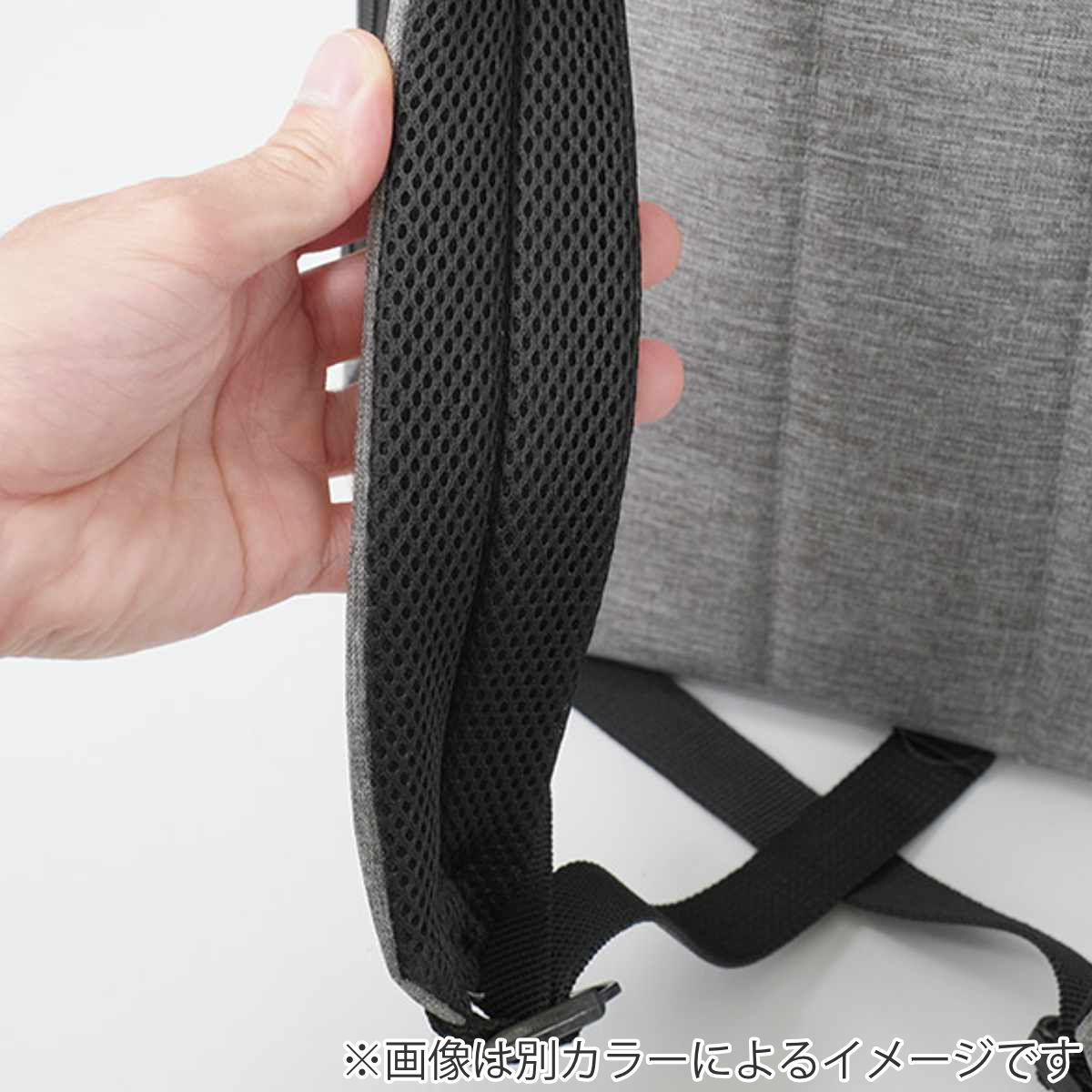 ショルダーベルトにはクッション性を持たせ、身体に当たる部分にはメッシュ素材を使用しています。長時間背負っていても、疲れにくく快適な使い心地です。ベルトはお好みの長さに自由に調節可能です。