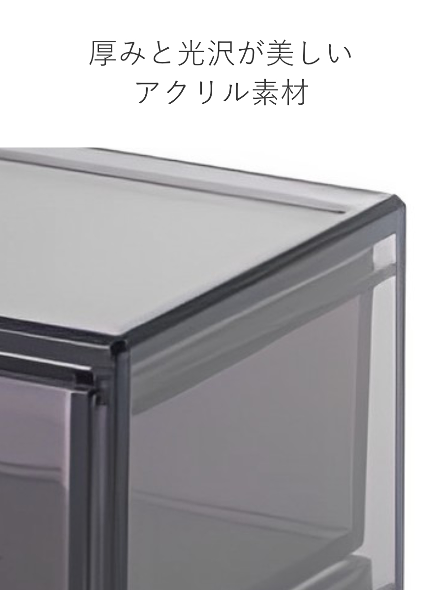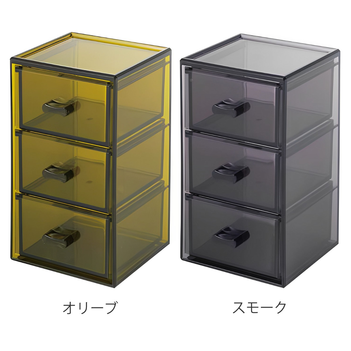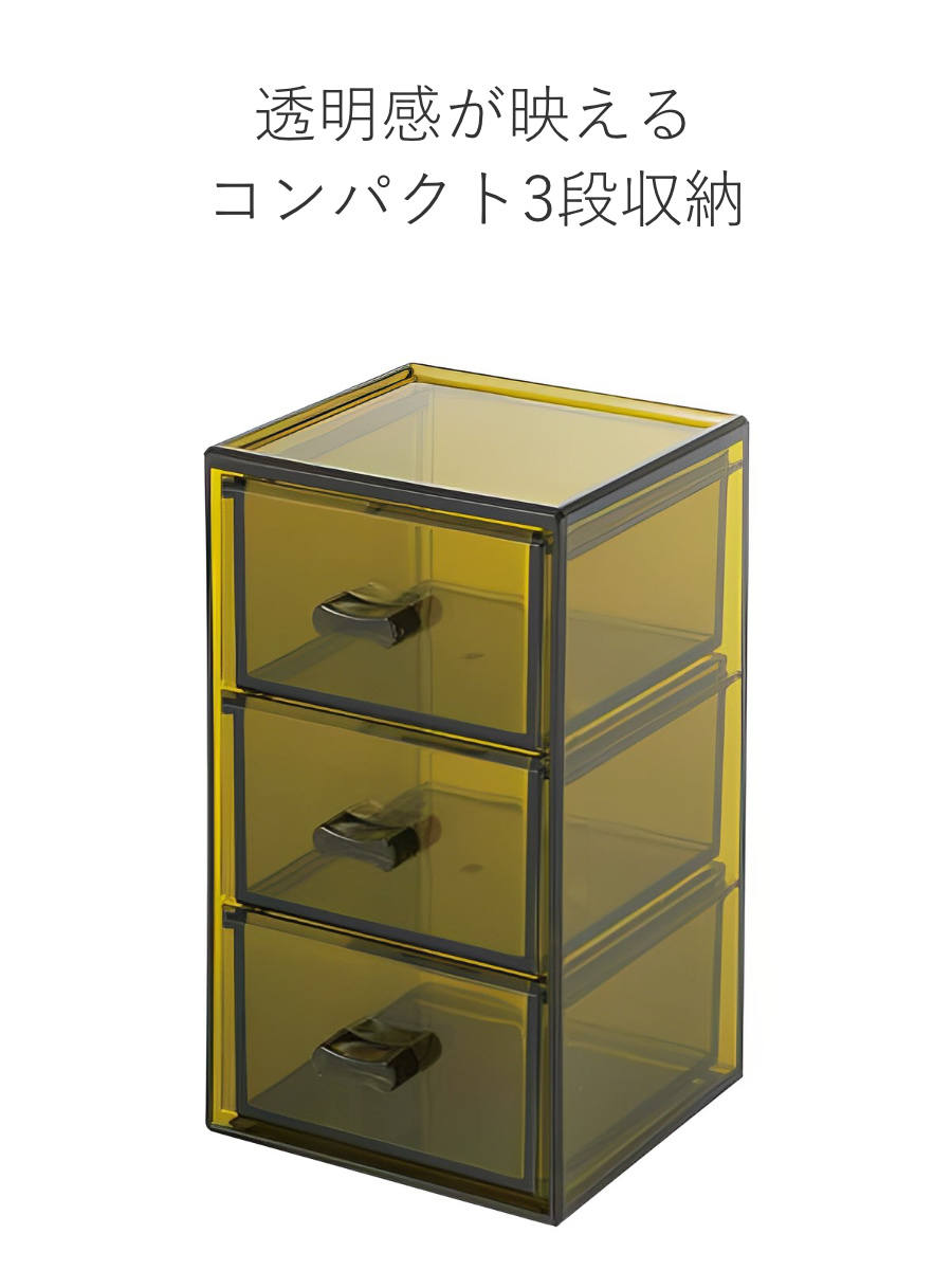ガラスのような美しい透明感を持つ、小さくても引き出しやすい3段ボックスです。洗面に置いて指輪やピアスなどの小物収納に便利で、無くしがちなアクセサリーの整理に最適です。