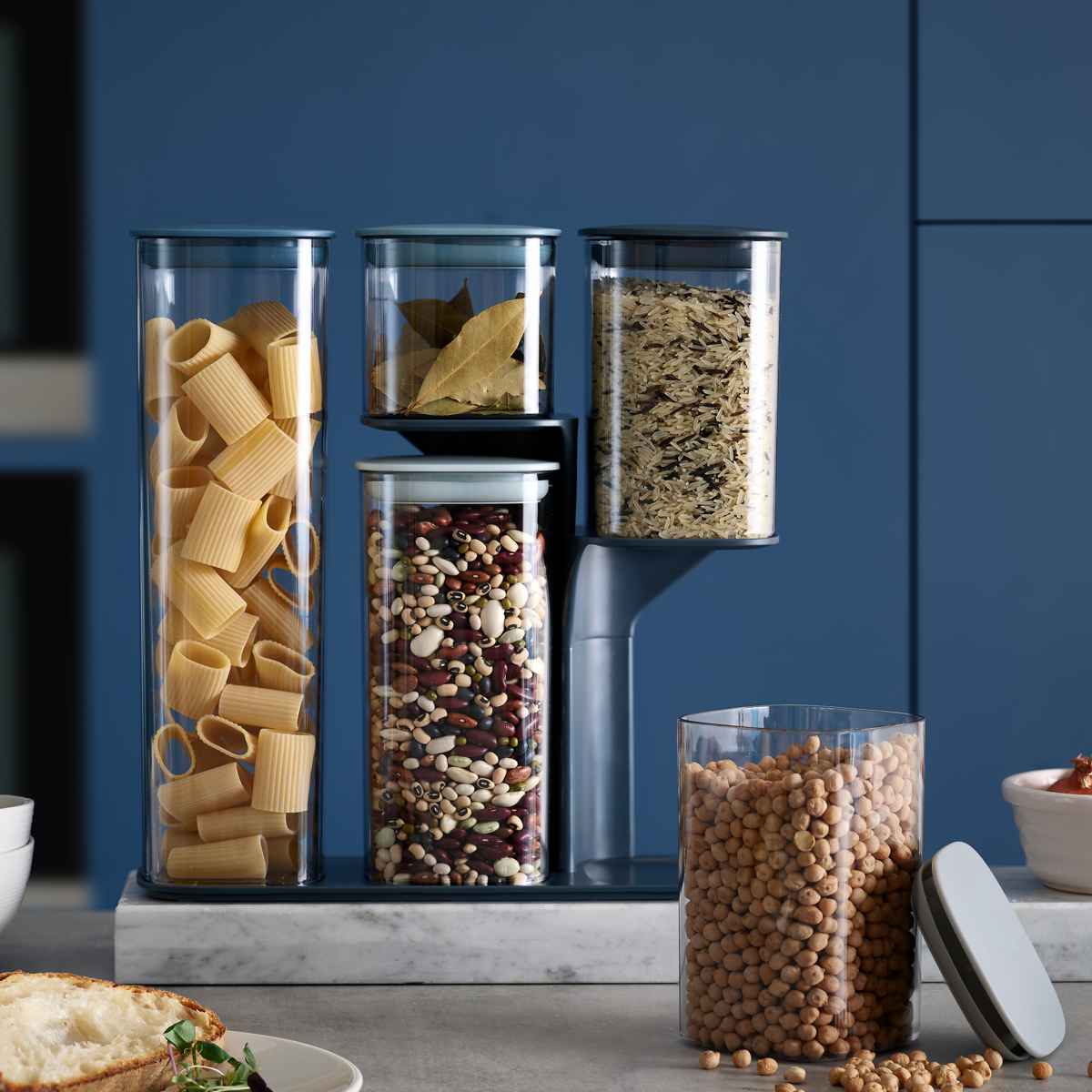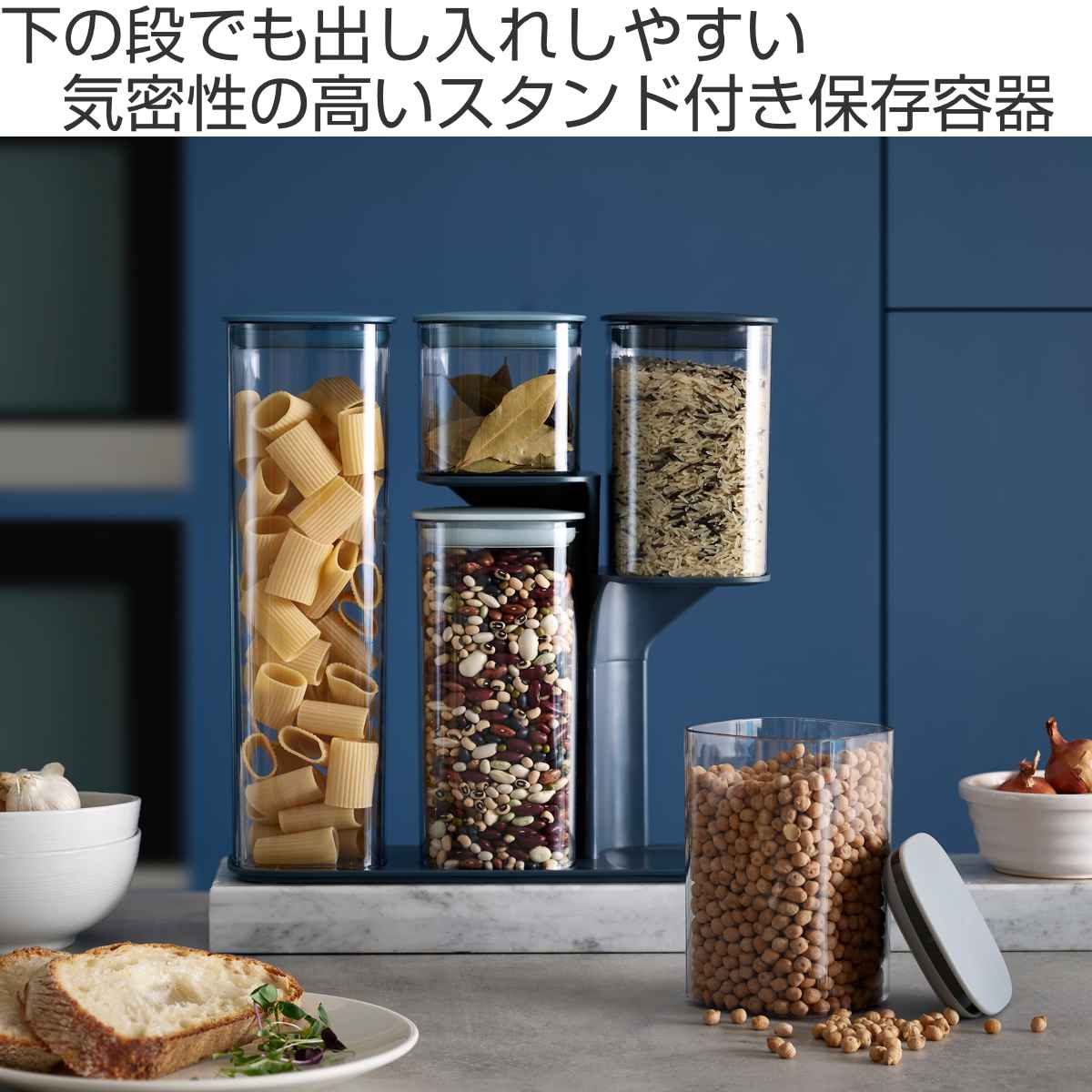 上の段の容器を動かさずに下の段の容器を取り出すことができるスタンドとセットの保存容器「ポディウム」。スタンドがあることでバラバラになりがちな保存容器をすっきり収納することができます。5個入り(500ml×1個、900ml×2個、1.3L×1個、1.9L×1個)です。