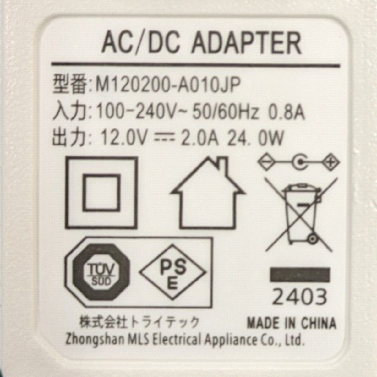 | 備考 | 入力電圧:AC100~240V 出力電圧:DC12V 入力電流:0.8A 出力電流:2A 入力周波数:50/60Hz 適合商品:トレビュアー トレース台450シリーズ B3/A2サイズ 届け出事業者名:株式会社トライテック 登録検査機関名称:TUV SUD PSマークの種類:PSEマーク |