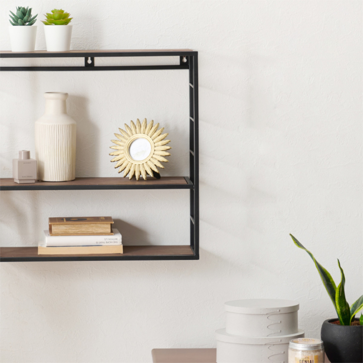 奥行き約15cmと薄型なので空間を圧迫することがなく、どんな場所にも設置がしやすい約幅約45cmの正方形型2段式ラックです。キッチン、リビング、デスク回り、サニタリールームなど色んなシーンでお使いいただけます。