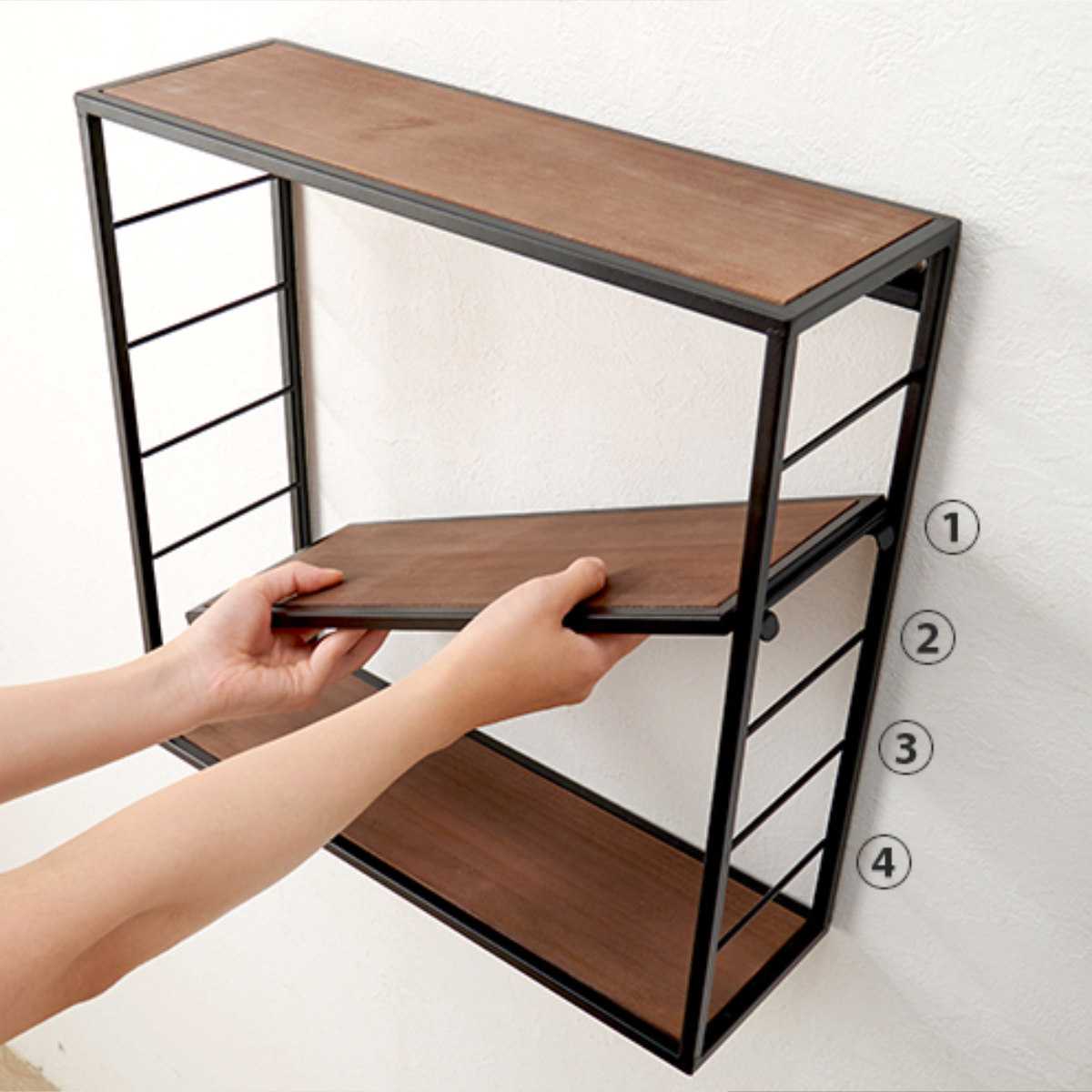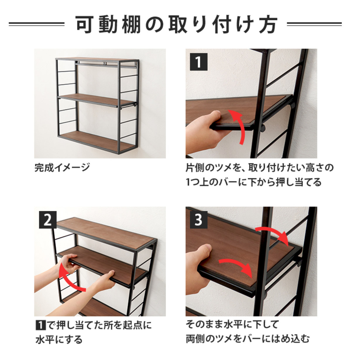 可動棚が1枚付属しており、置くものに合わせて4段階の調整が可能です。1番上のバーには設置ができませんのでご注意ください。