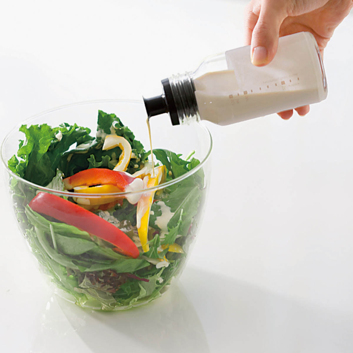食卓にもそのまま出せる、シンプルなデザインのドレッシングボトルです。目盛り付きなので、計量スプーンやカップを使わずに調味料を入れることができ、シェイクするだけで簡単にドレッシングが作れます。スリムな形状なので、冷蔵庫のドアポケットにもすっぽり入り、そのまま保存もできます。