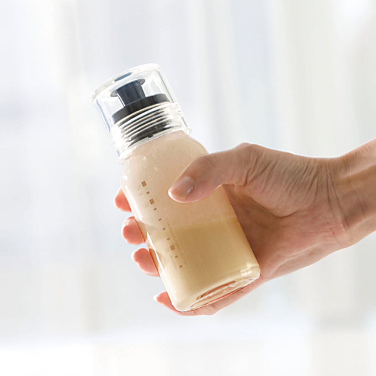フタに注ぎ口がピタっと密着するので、液体がこぼれず、しっかり混ぜ合わせることができます。