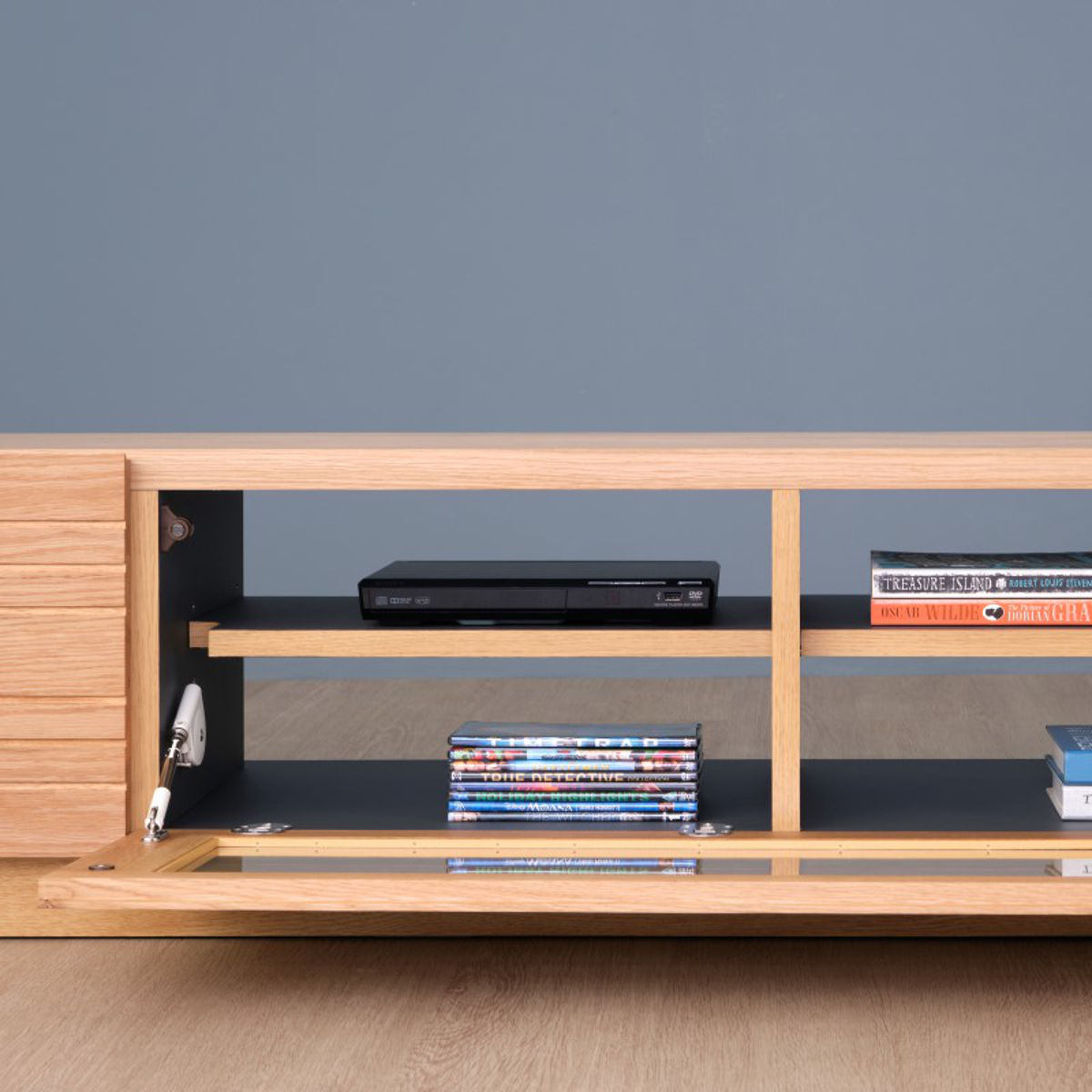 両サイドにはDVDや小物の収納に便利な引出し収納