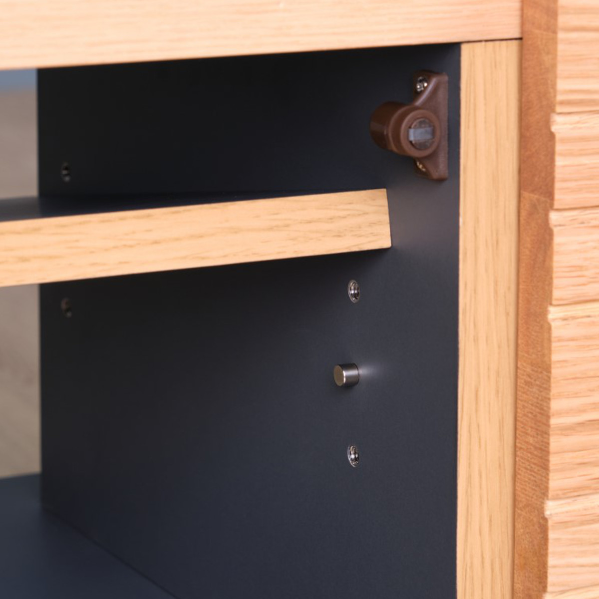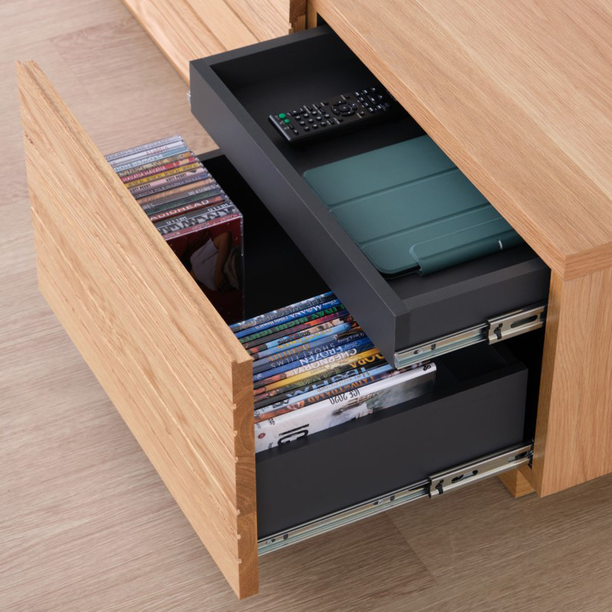 両サイドには小物の収納に便利な引出し収納付きです。引出しを開けると内側の上段にもう一段浅型の引出しが付いているので、リモコンやDVDなど収納物に合わせて使い分けていただけます。