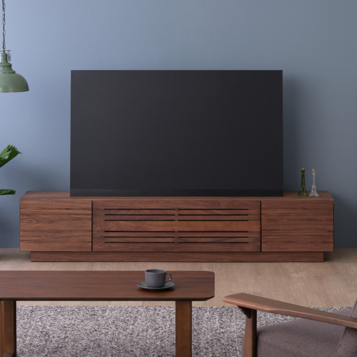 住空間にマッチするように考えられた、シンプルモダンなデザインのテレビ台です。木の温かみを感じるウォルナット材を使用しており、ブラウンカラーはお部屋の雰囲気を引き締め落ち着いた空間にしてくれます。