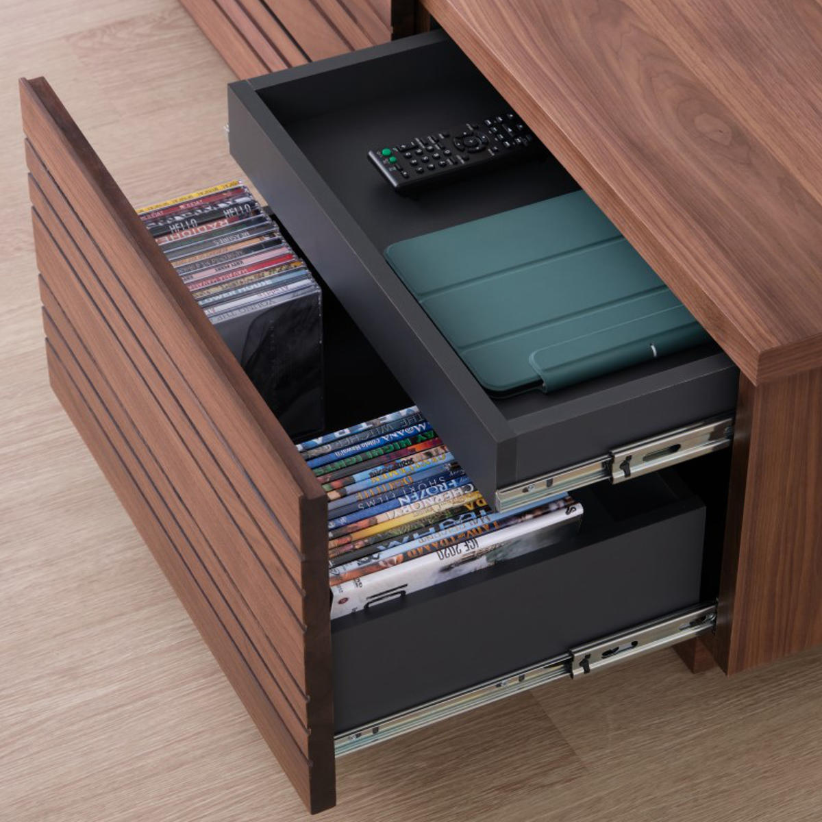 両サイドには小物の収納に便利な引出し収納付きです。引出しを開けると内側の上段にもう一段浅型の引出しが付いているので、リモコンやDVDなど収納物に合わせて使い分けていただけます。