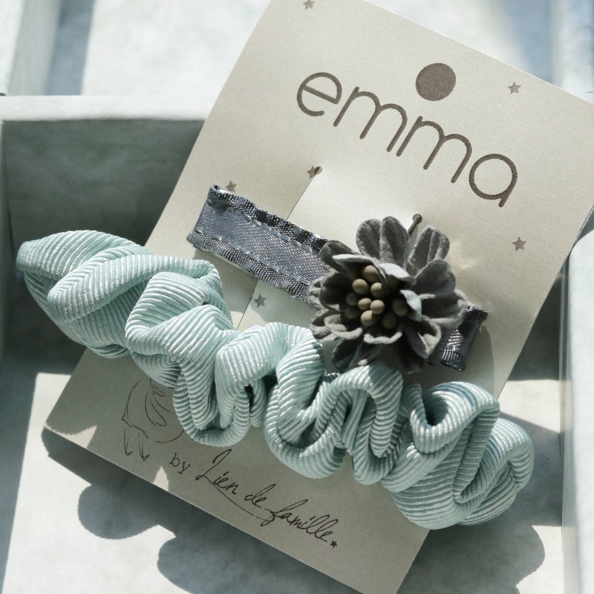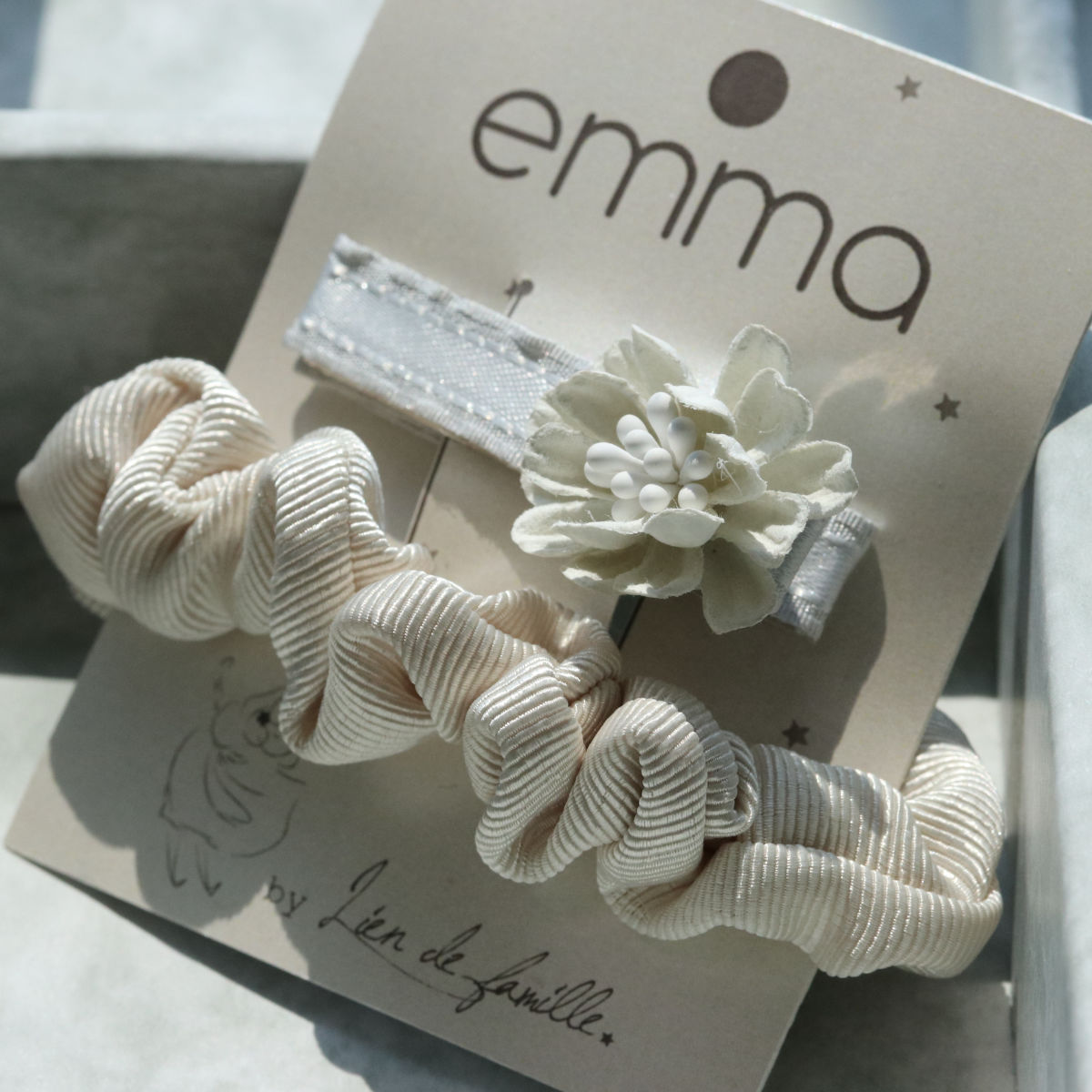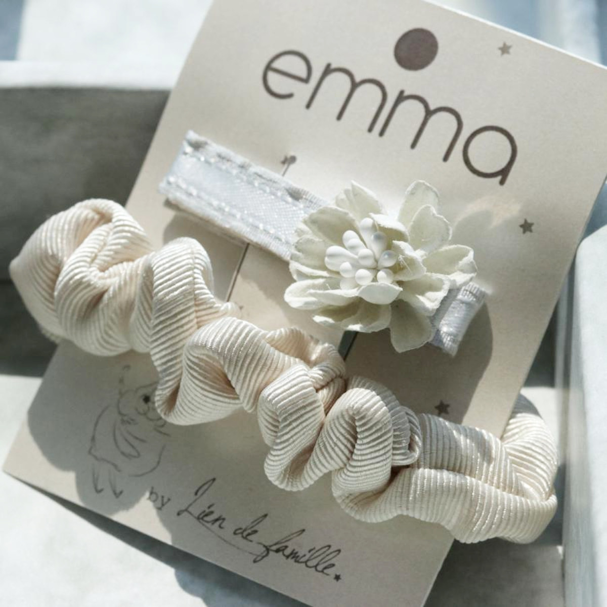 髪の毛を結ぶシュシュと、かわいく飾るヘアクリップのセットです。ひとつあればおしゃれなヘアアレンジが完成します。くすみカラーが特徴で、大人っぽすぎず、可愛らしすぎず、絶妙なニュアンスでおしゃれを楽しんでいただけます。