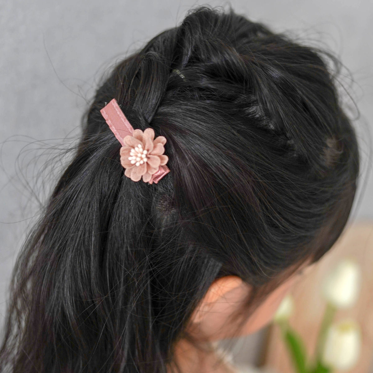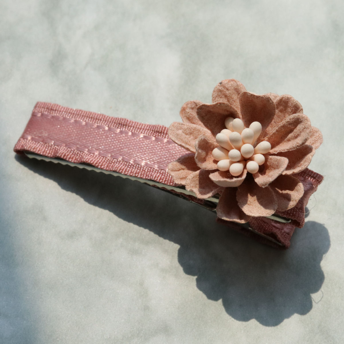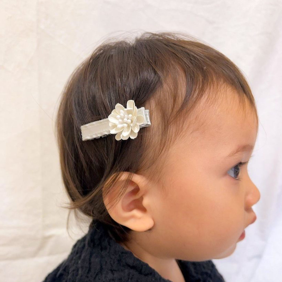 かわいいお花が付いたヘアクリップは、お子様の柔らかな髪の毛もしっかりキャッチします。ピンの部分は同系色のテープで装飾された華やかなデザインです。優しい色合いなので、入園、誕生日、初節句、お祭りや発表会など、行事やお祝い事にもぴったりです。