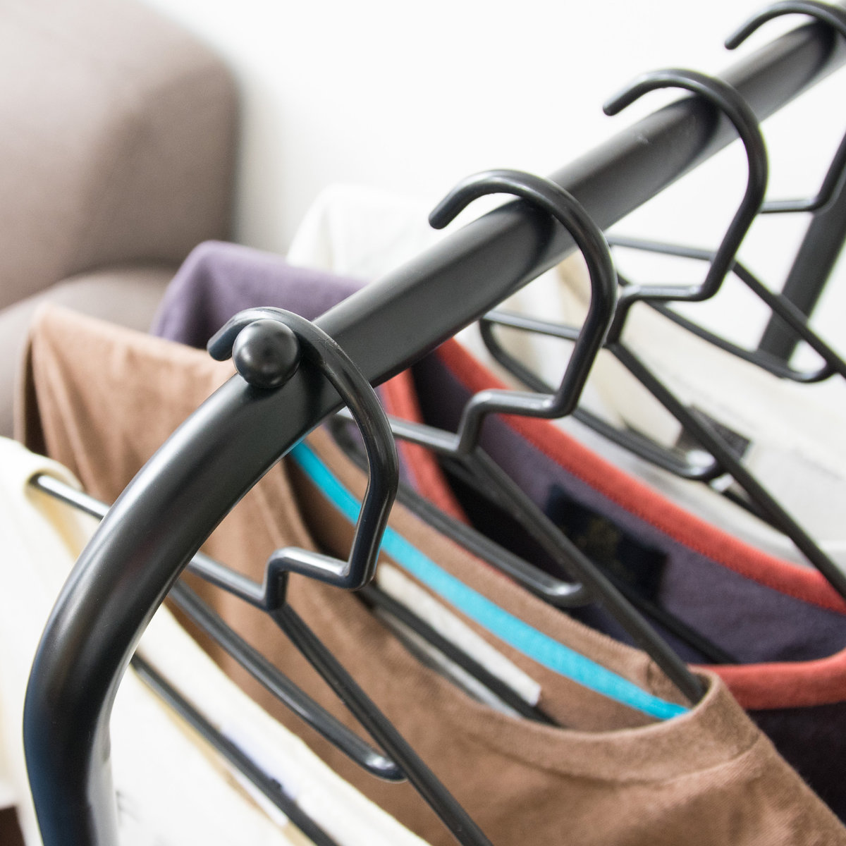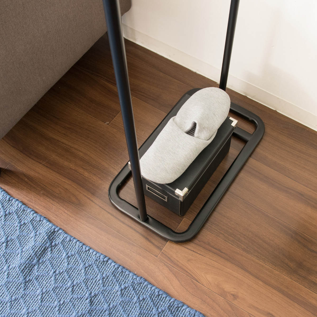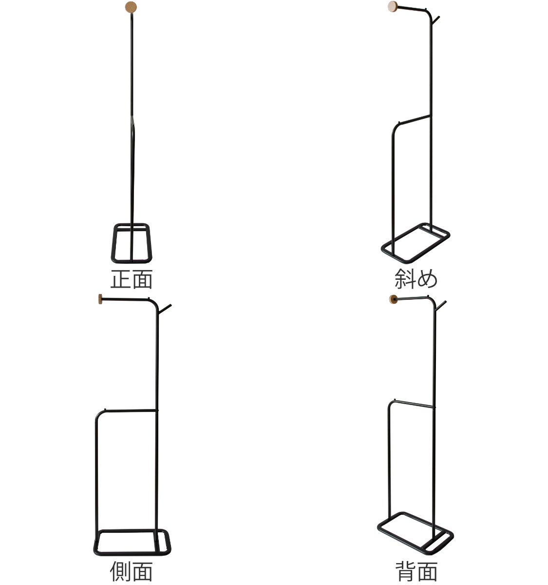 | 強度の高いスチール製 衣類を支えるシックな黒いフレームは強度の高いスチール製です。 | 水やキズに強い塗装 傷や水に強いエポキシ樹脂の粉体塗装を施しているので玄関などで水に濡れる事があっても安心です。 |