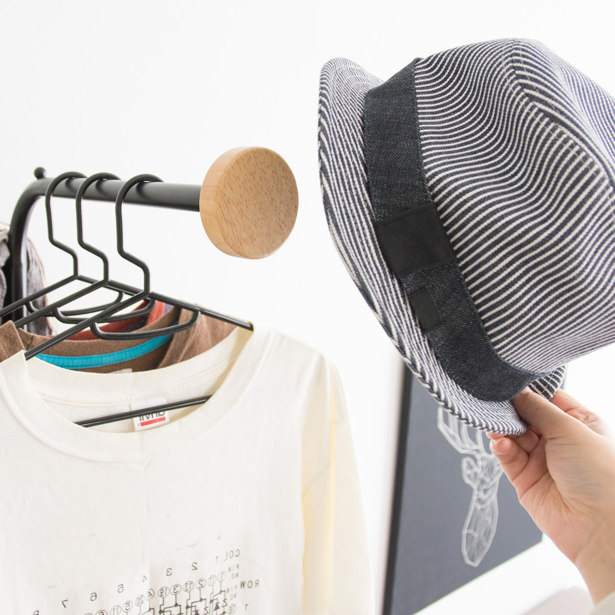 | 天然木使用 上段の先端には柔らかい木目と丈夫さが特徴の天然木を付けており帽子をかけても傷つける心配がありません。 | コートもかけられる 背面部分にはストールやコートなどの長い物を掛けられるフックがあります。 |