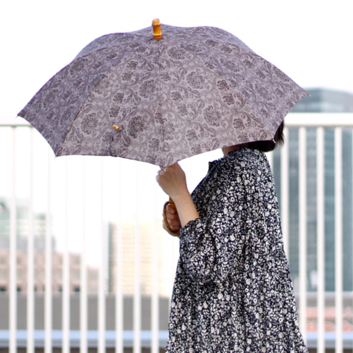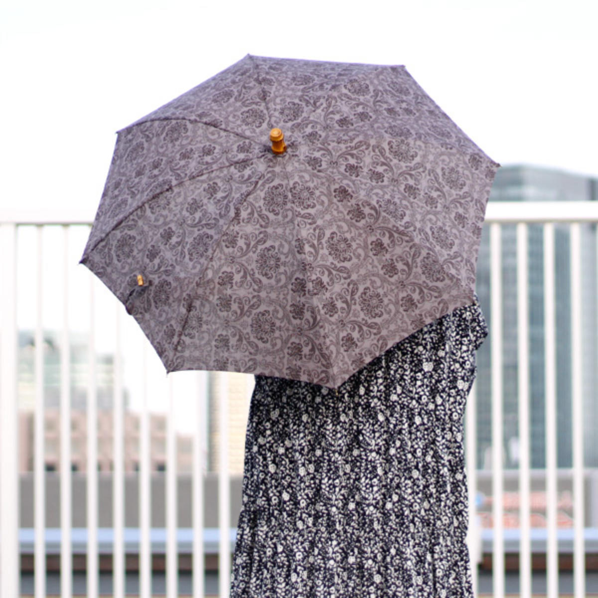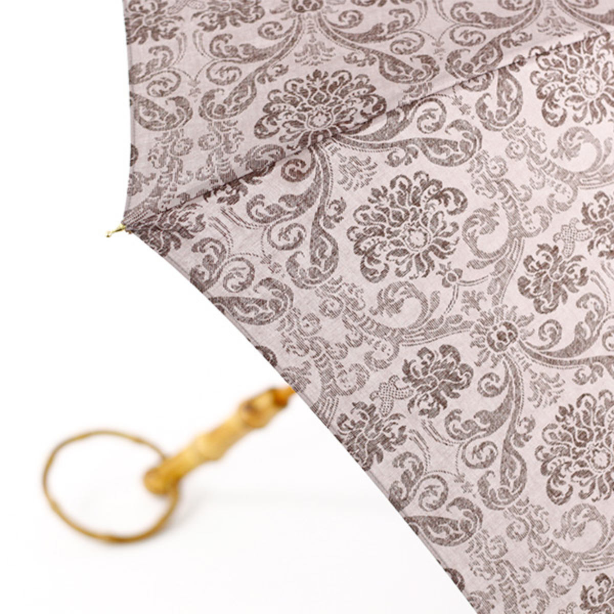 綿麻の混合生地にダマスク柄が描かれた日傘です。持ち手は天然木を使用しており、素材それぞれの良さが引き立つ見た目も美しい日傘です。上質で飽きのこないシンプルなデザインです。