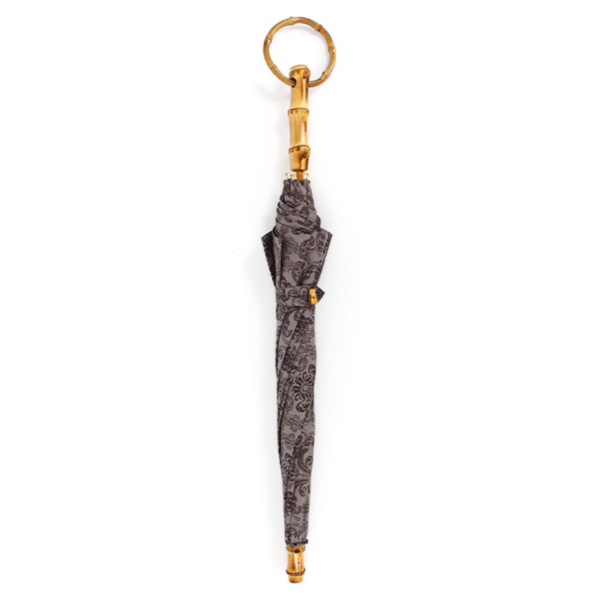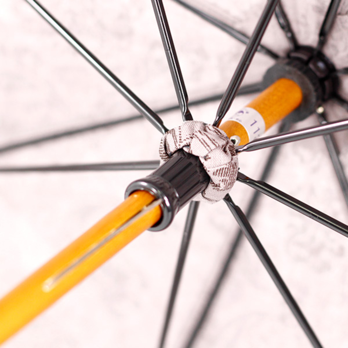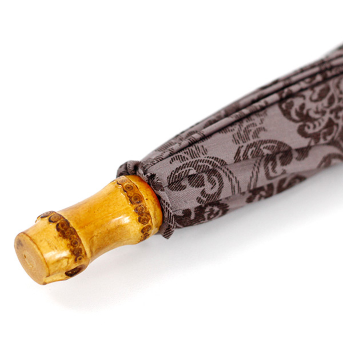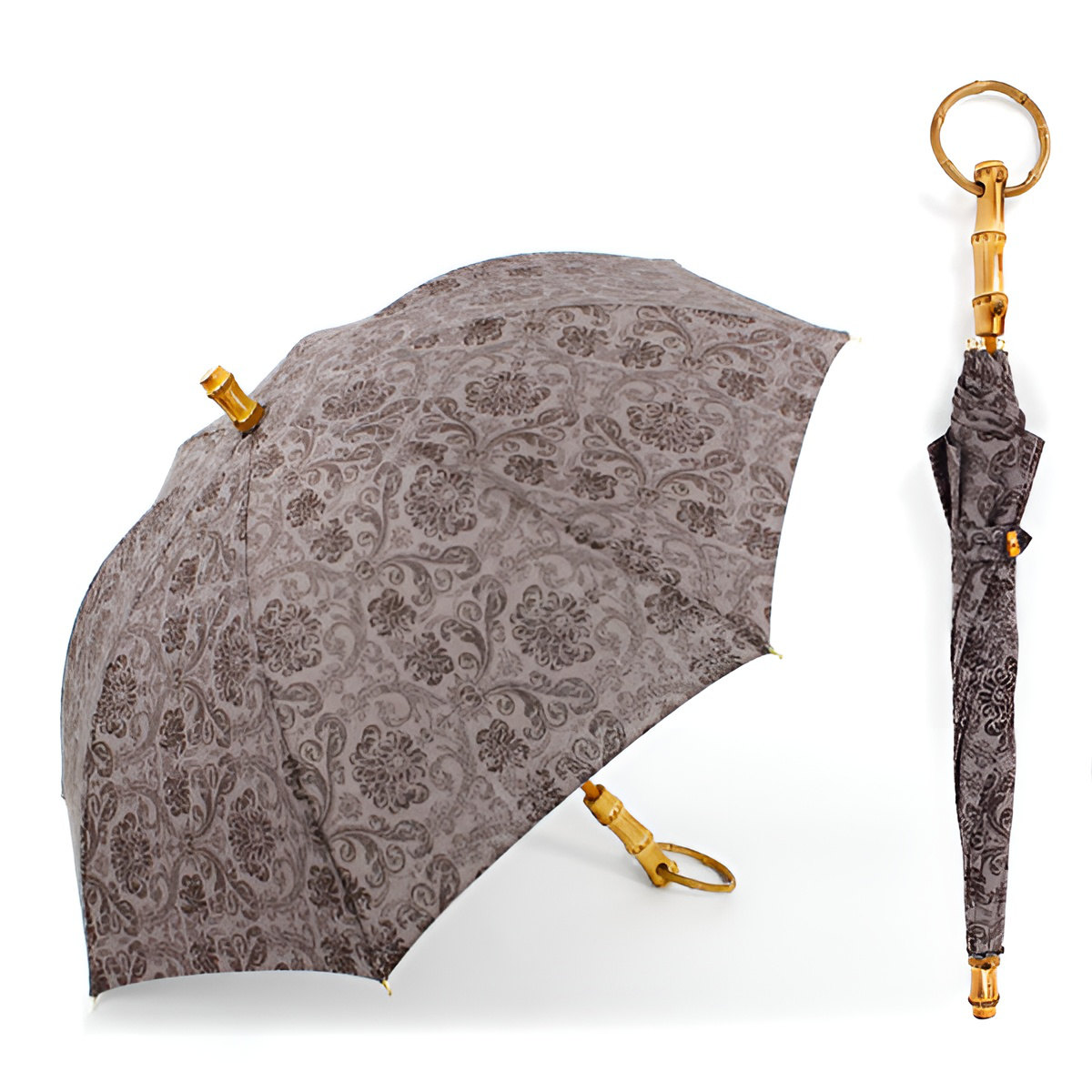 綿麻の混合生地にダマスク柄が描かれた日傘です。持ち手は天然木を使用しており、素材それぞれの良さが引き立つ見た目も美しい日傘です。上質で飽きのこないシンプルなデザインです。