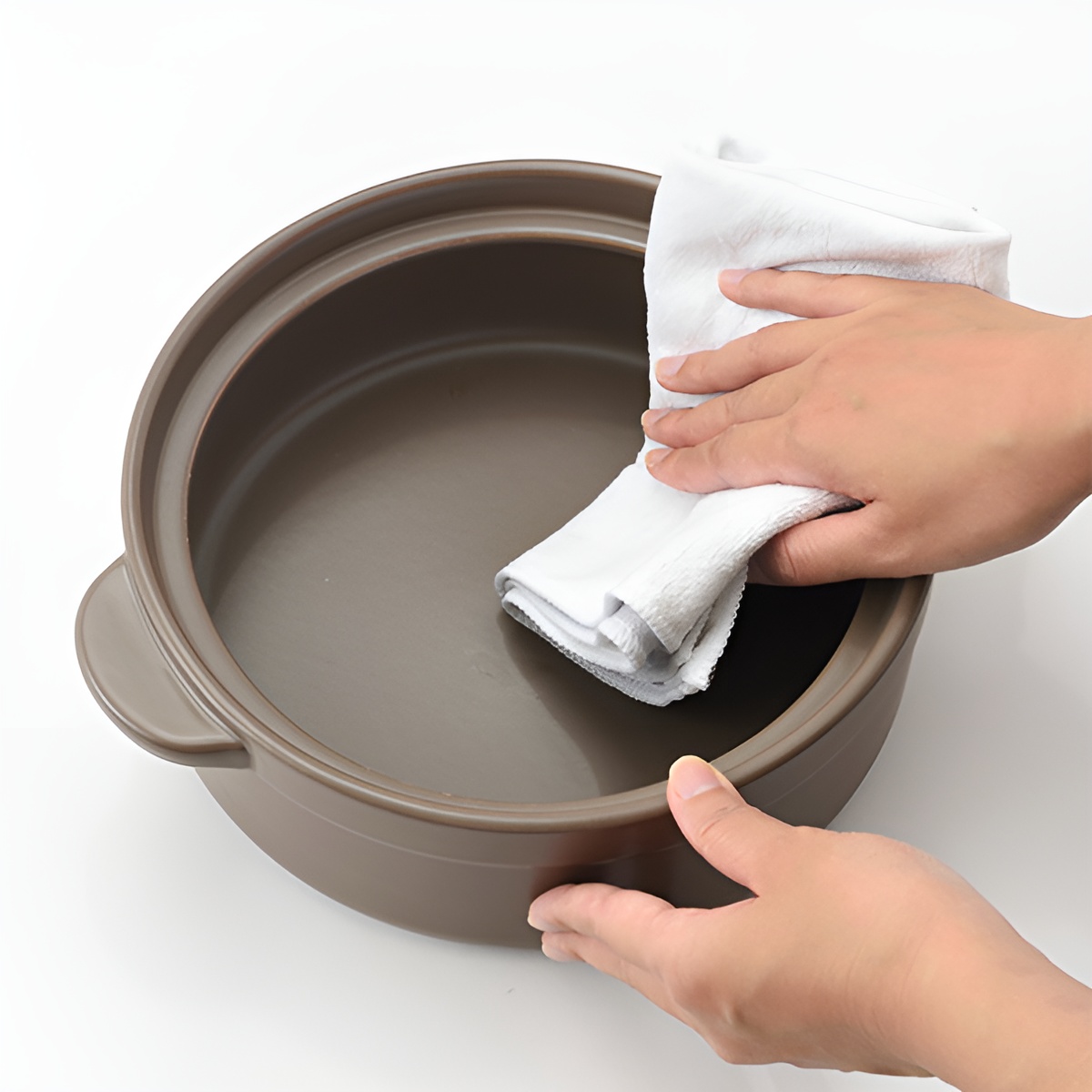 一般的な土鍋に必要な目止め処理がいらず、汚れにくく、ニオイ移りしにくい表面になっています。また、本体と取っ手の継ぎ目がないので、大きなお皿を洗っている感覚で洗うことができ、お手入れ簡単です。