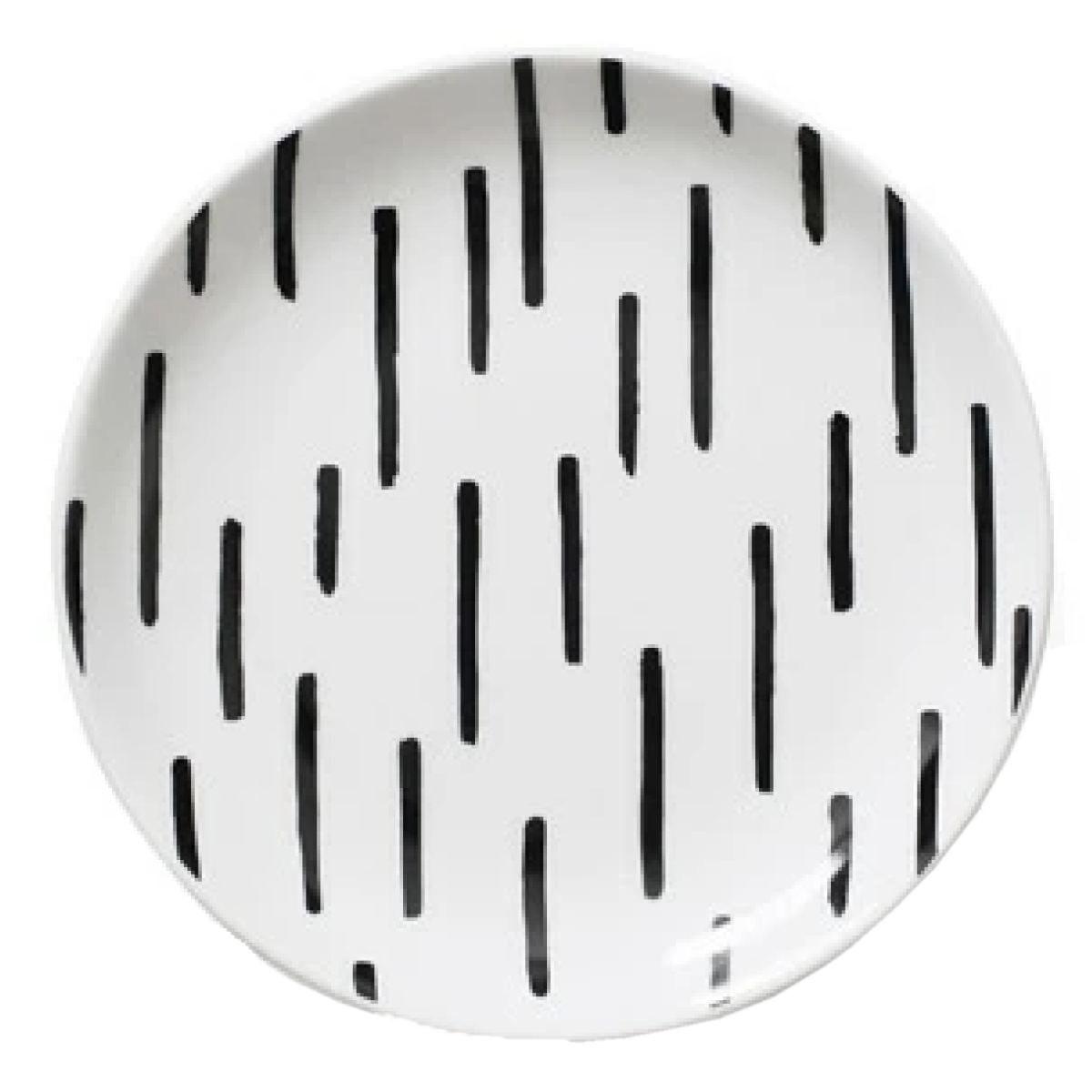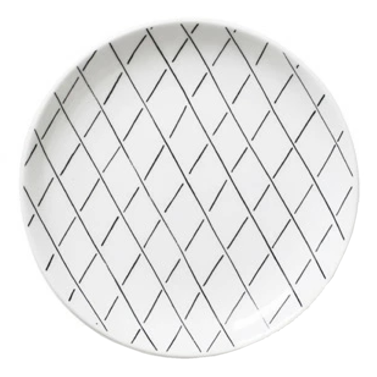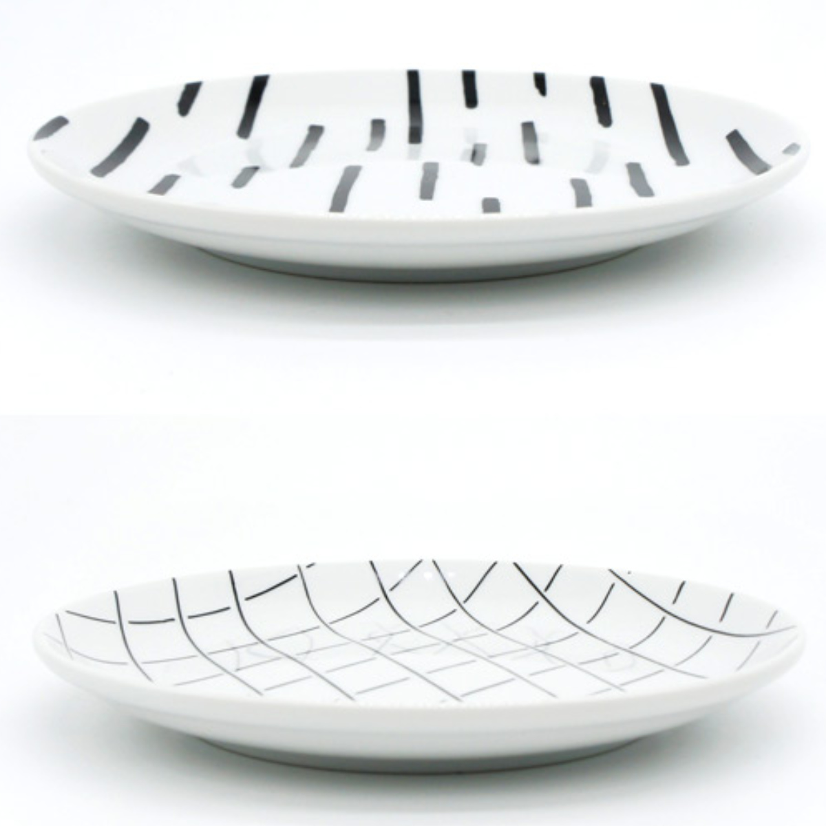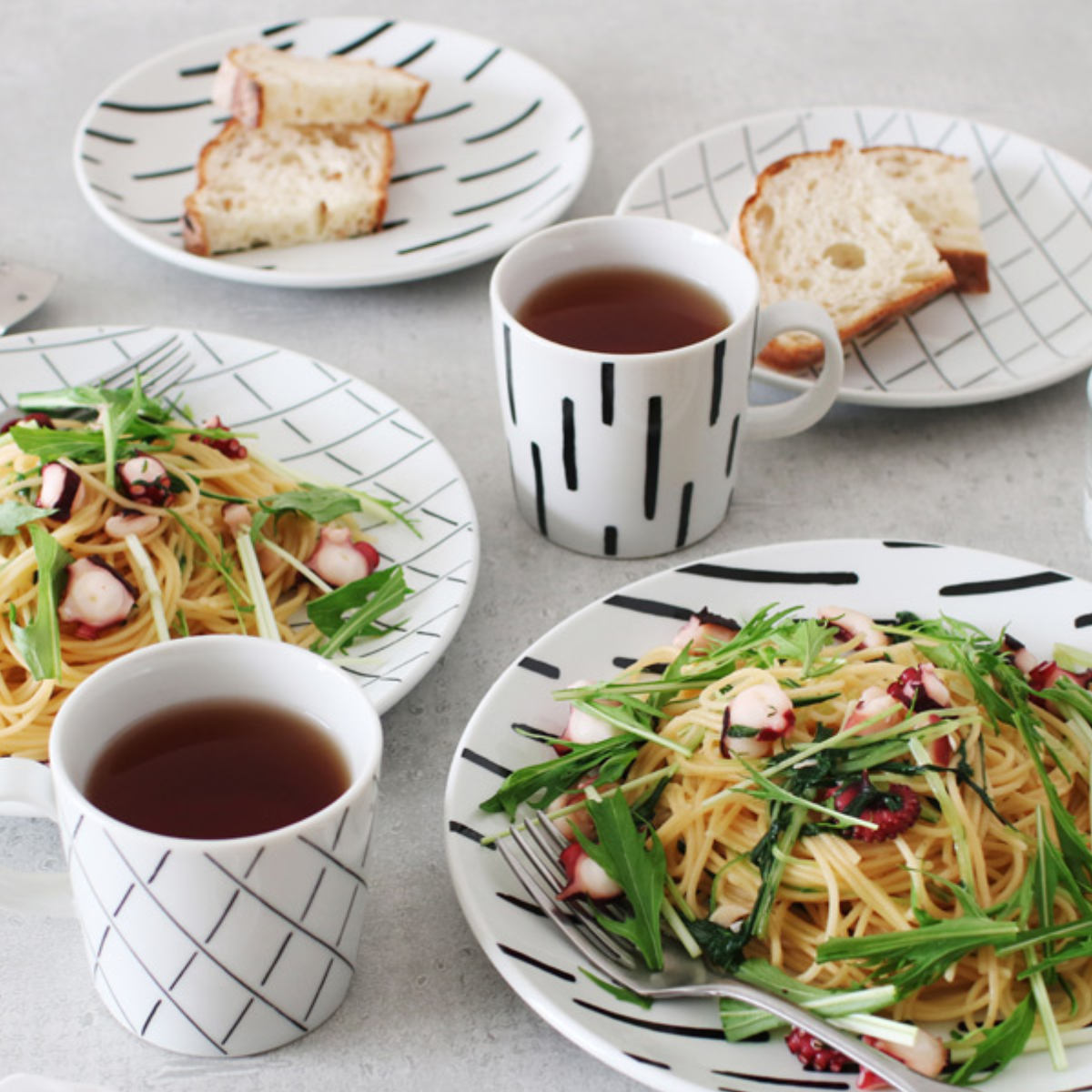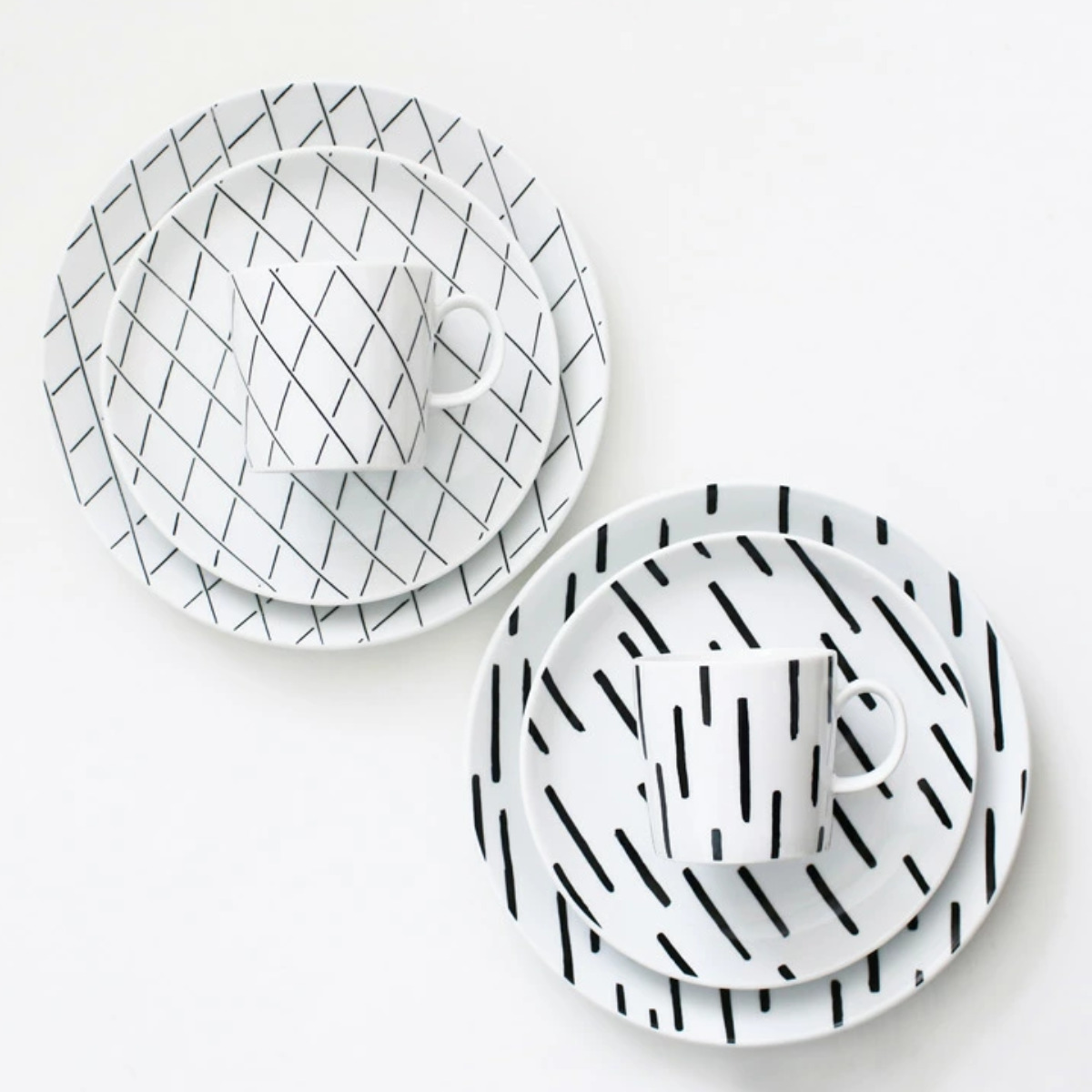 イラストレーターのかおりさんが一筆一筆丁寧に描いています。ドットは大きな雨粒のような独特の水玉模様が印象的で、モノトーンカラーがスタイリッシュな雰囲気を演出しています。格子模様のチェックは、日本人にはなじみのある網目の器のようであり、和食器にはないスッキリした新しさのある柄です。