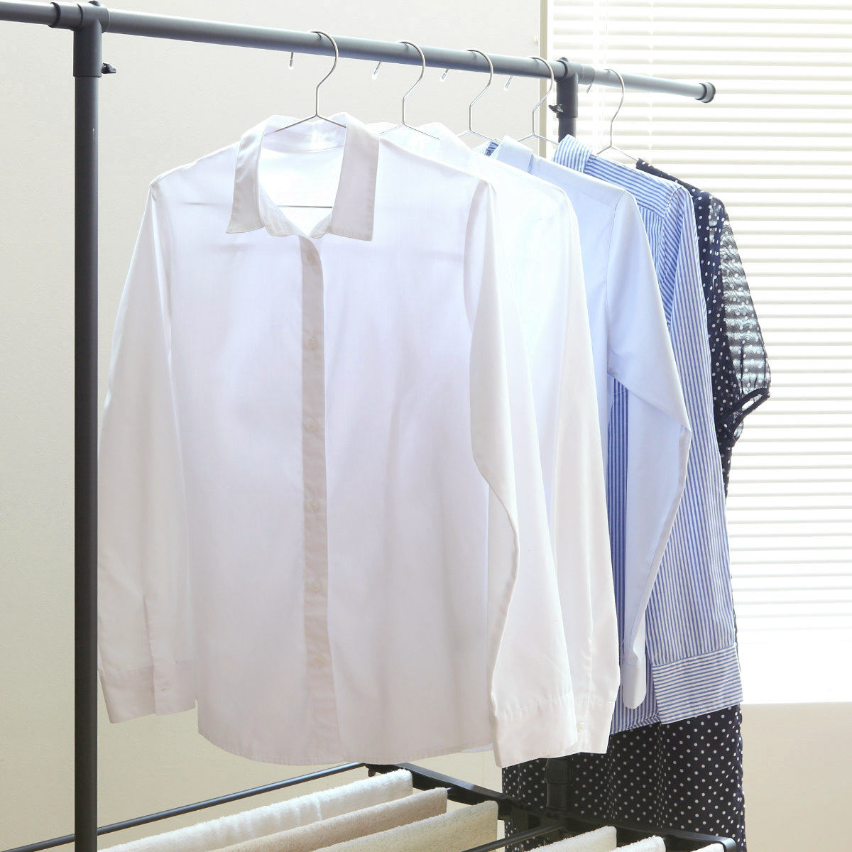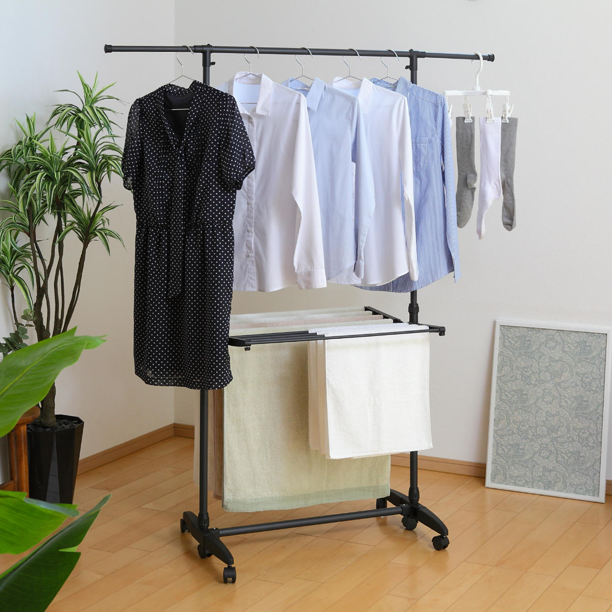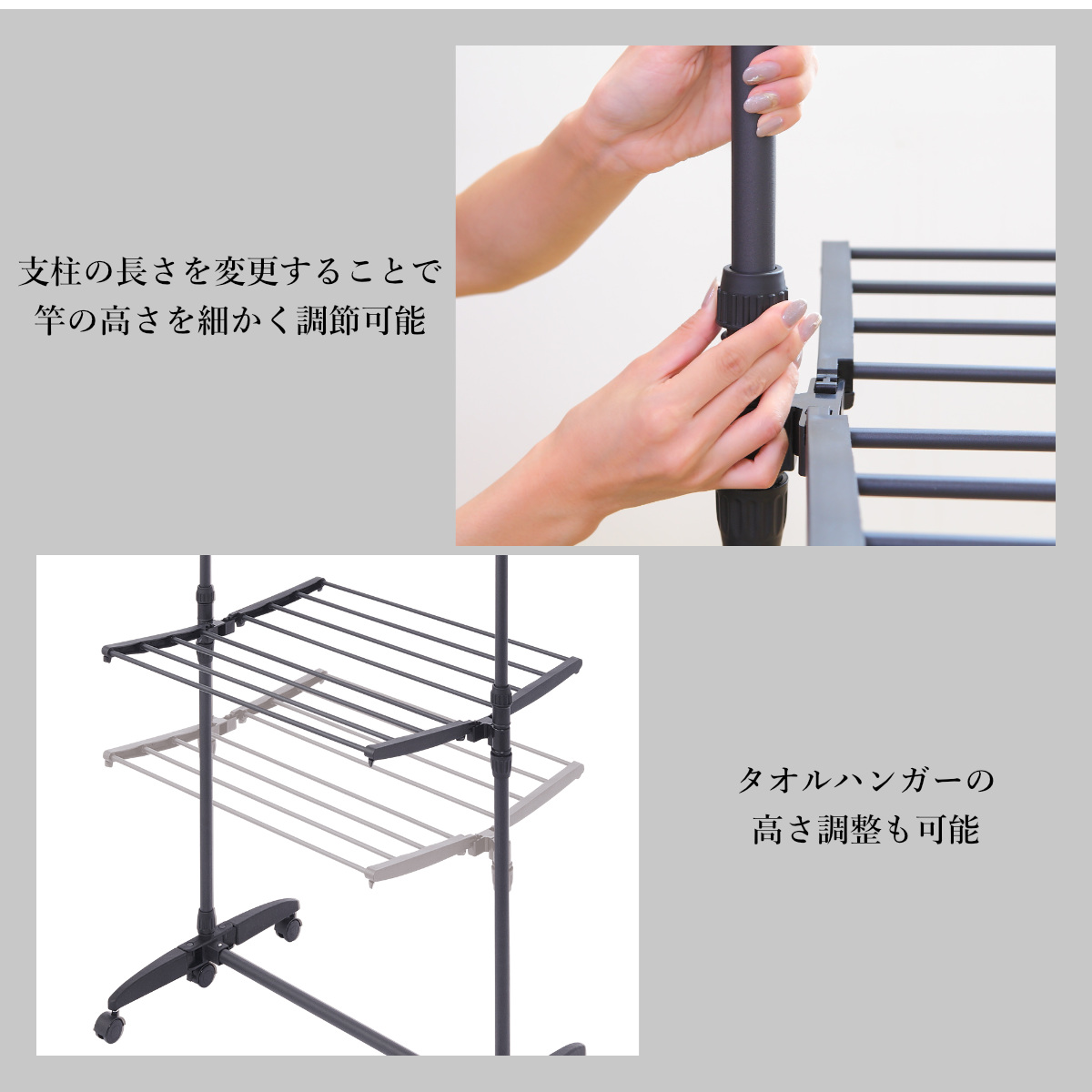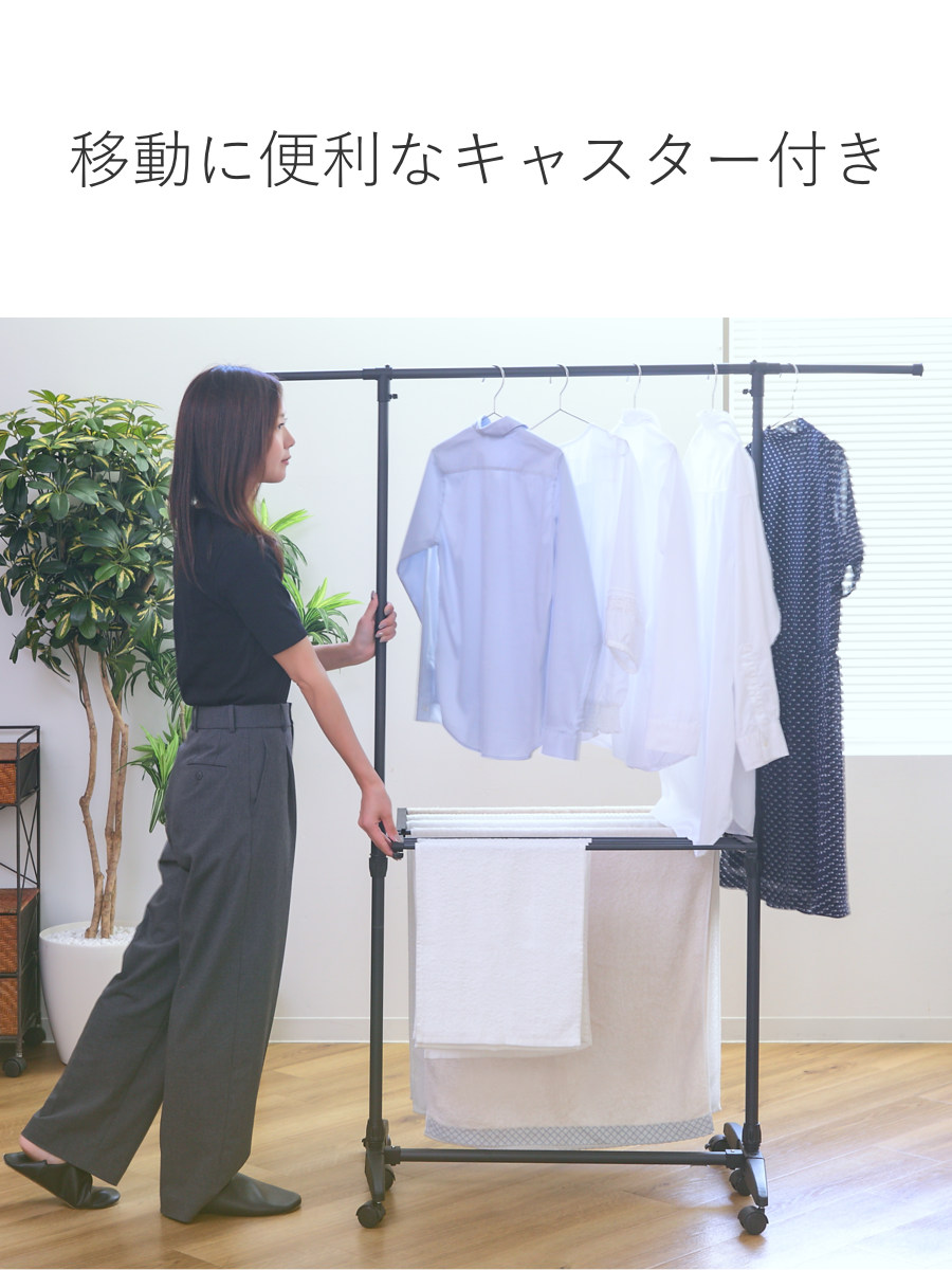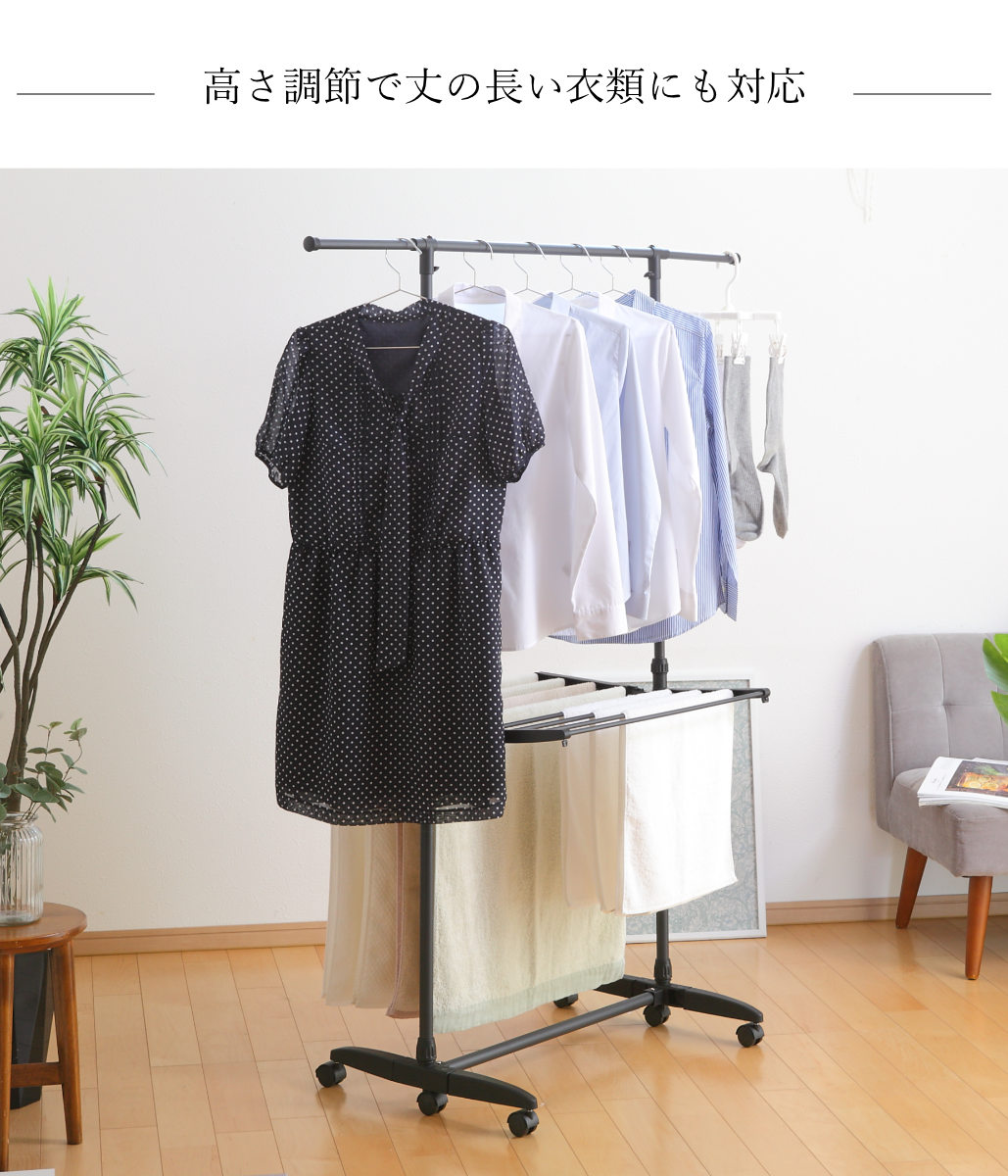 干す物に合わせて高さを調節できるため、ワンピースのような丈の長い衣類も床につかずに干すことができます。またタオルハンガーの高さ調整も可能です。