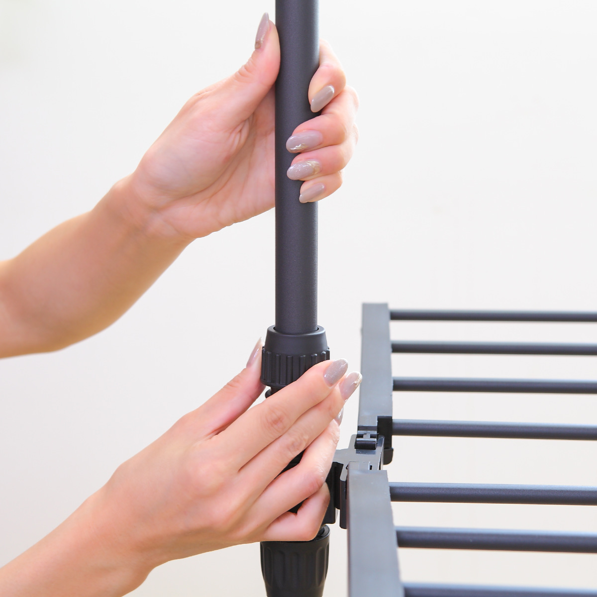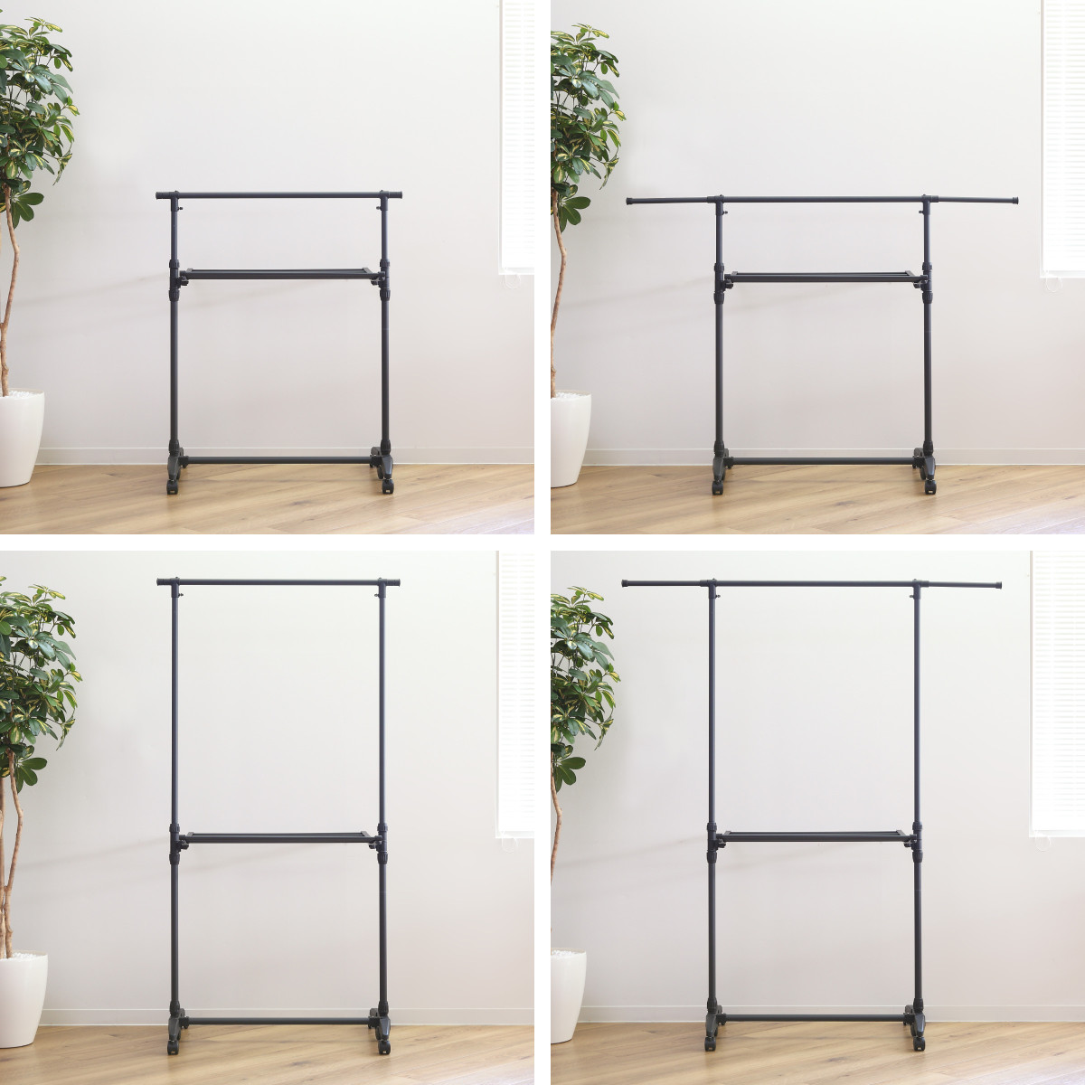 生活感が出やすい物干しも、落ち着いたブラックカラーなら、空間を引き締めてインテリアに自然と溶け込みます。指紋やホコリが目立ちにくいため使いやすく、シンプルながら洗練された印象を与える、見た目と実用性を兼ね備えた1台です。