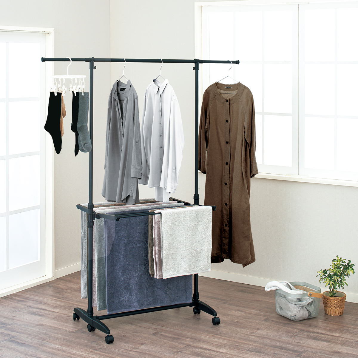衣類から小物まで様々な物を干せるH型の室内物干しです。伸縮する竿とタオルハンガーでたっぷり干せるので、まとめて1~2人分の洗濯物を干すのにぴったりです。