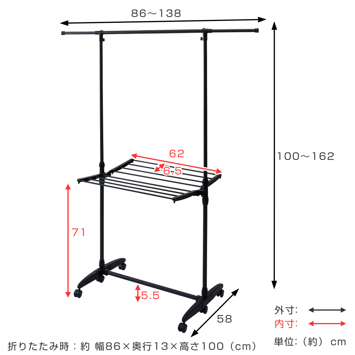 | サイズ | 約 幅86~138×奥行58×高さ100~162(cm) 折りたたみ時:約 幅86×奥行13×高さ100(cm) |