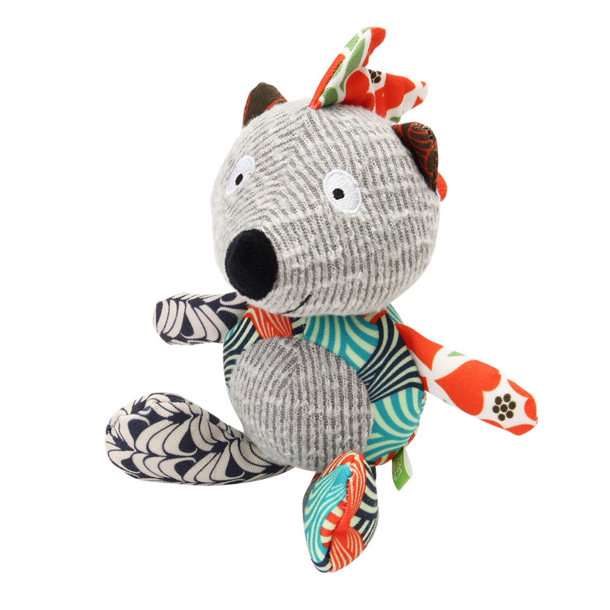 ●まるで大自然の様子を表しているようなカラフルな柄とオレンジ色が目を引く、オオカミのおもちゃです。