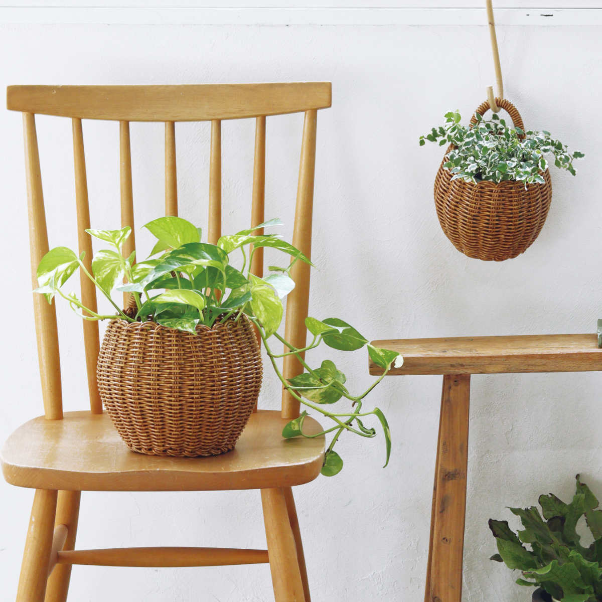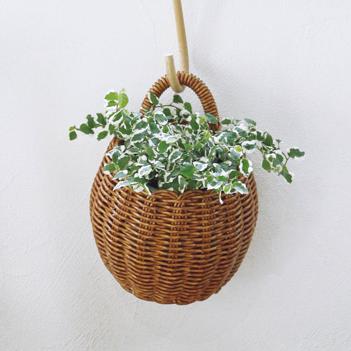 汚れてもサッと水洗いができるので、観葉植物も安心して入れることができます。取っ手があるのでS字フックに掛けて、壁に飾ることができます。
