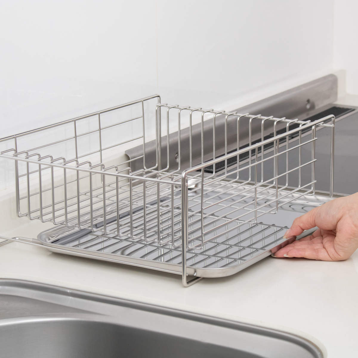 食器から落ちた水をしっかり受け止めるトレーは、手前から簡単に引き出せて水捨てもスムーズです。丸洗いができるので清潔にお使いいただけます。