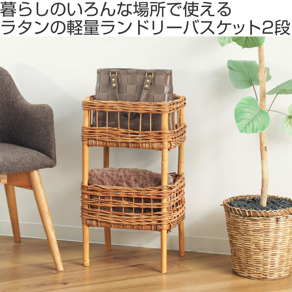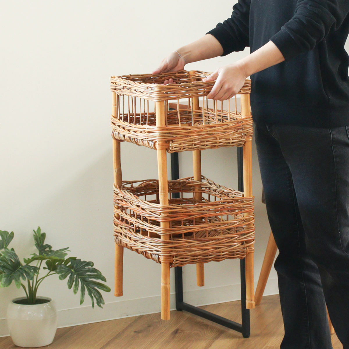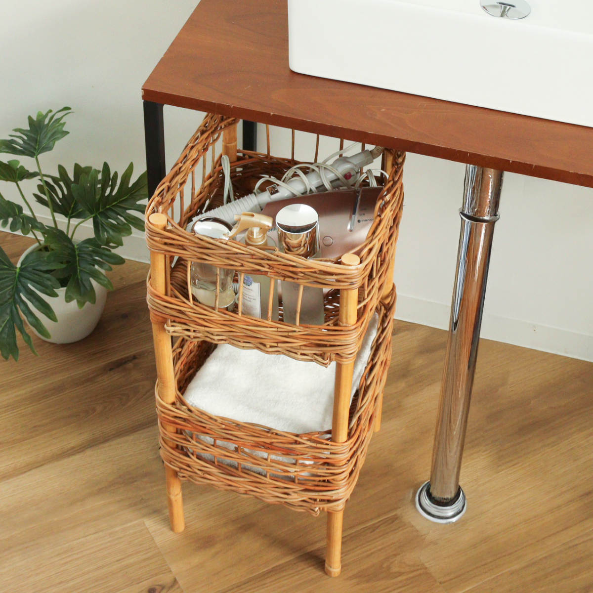 散らかりがちなアイテムをスッキリ収納でき、洗面台下や机の下に設置できる、ラタン製の2段バスケットです。自然素材ならではの温かな風合いを活かしたデザインで、収納しながら空間をおしゃれに演出します。