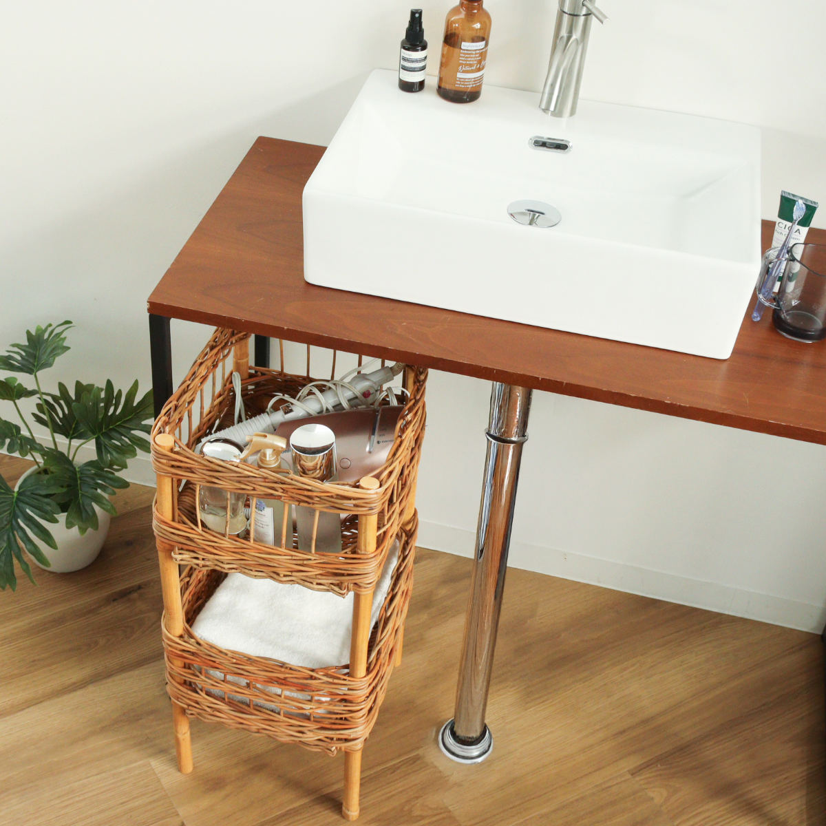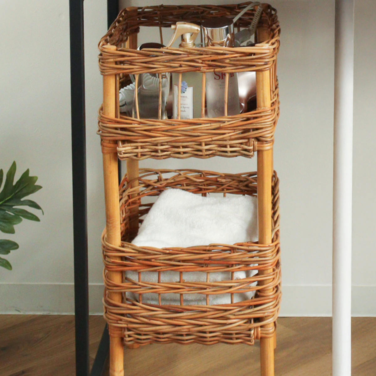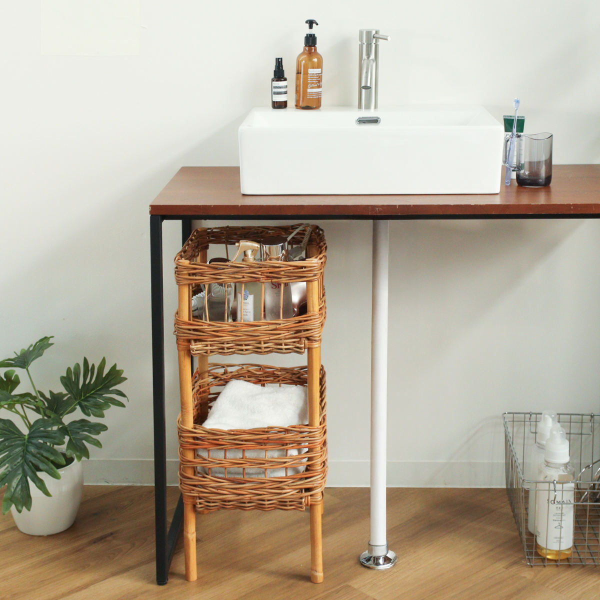 散らかりがちなアイテムをスッキリ収納でき、洗面台下や机の下に設置できる、ラタン製の2段バスケットです。自然素材ならではの温かな風合いを活かしたデザインで、収納しながら空間をおしゃれに演出します。