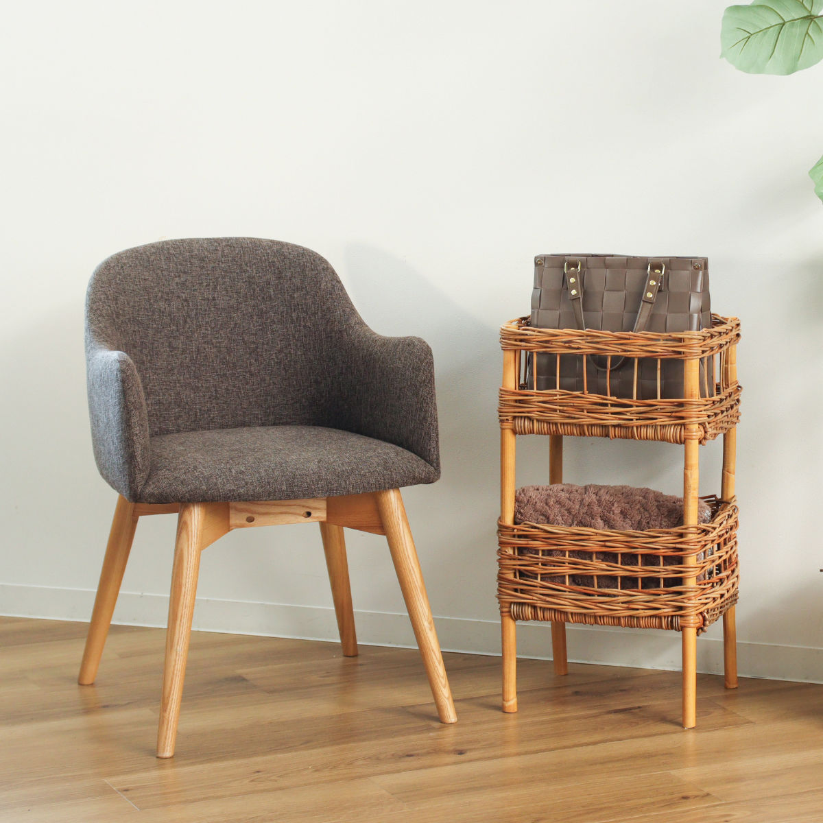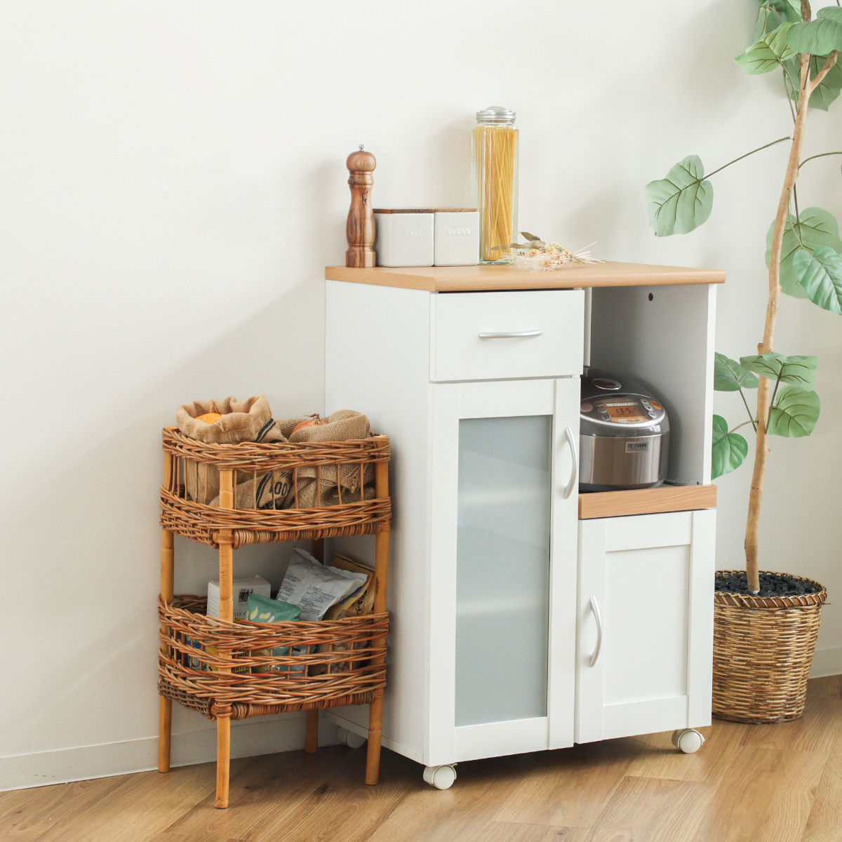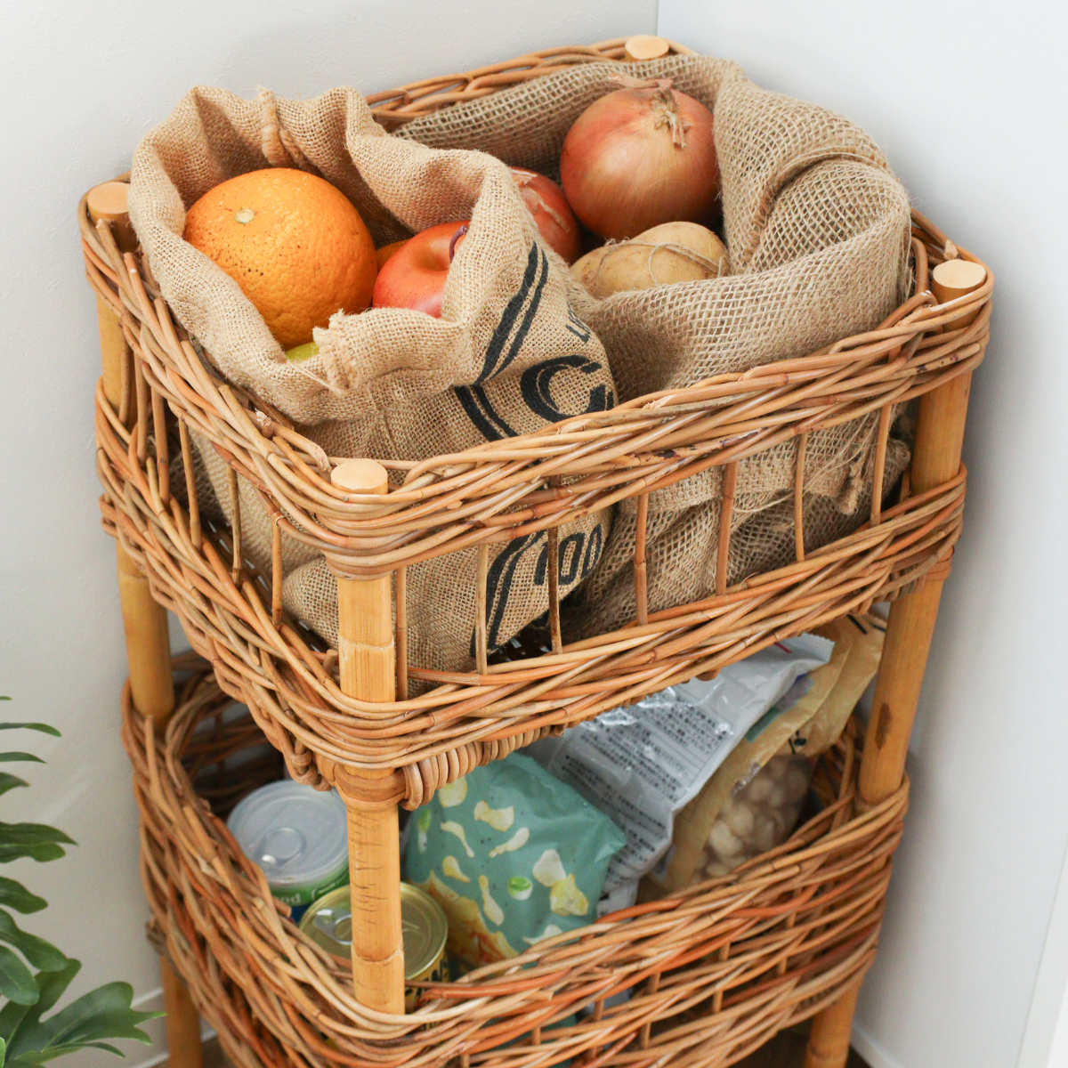 吸湿性と通気性に優れたラタン素材を使用しているため、キッチンや洗面所などにも気軽に置いていただけます。植物を飾るプランターとして使うのもおすすめです。