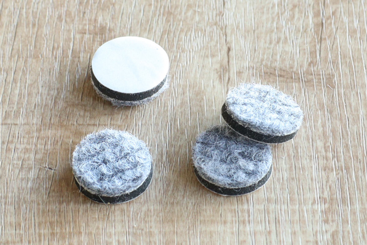 持ち手部分には白い布タグがさりげなく結ばれており、ナチュラルなアクセントになっています。また、脚底に貼るフェルトも付属しており、フローリングを傷や汚れから守ります。