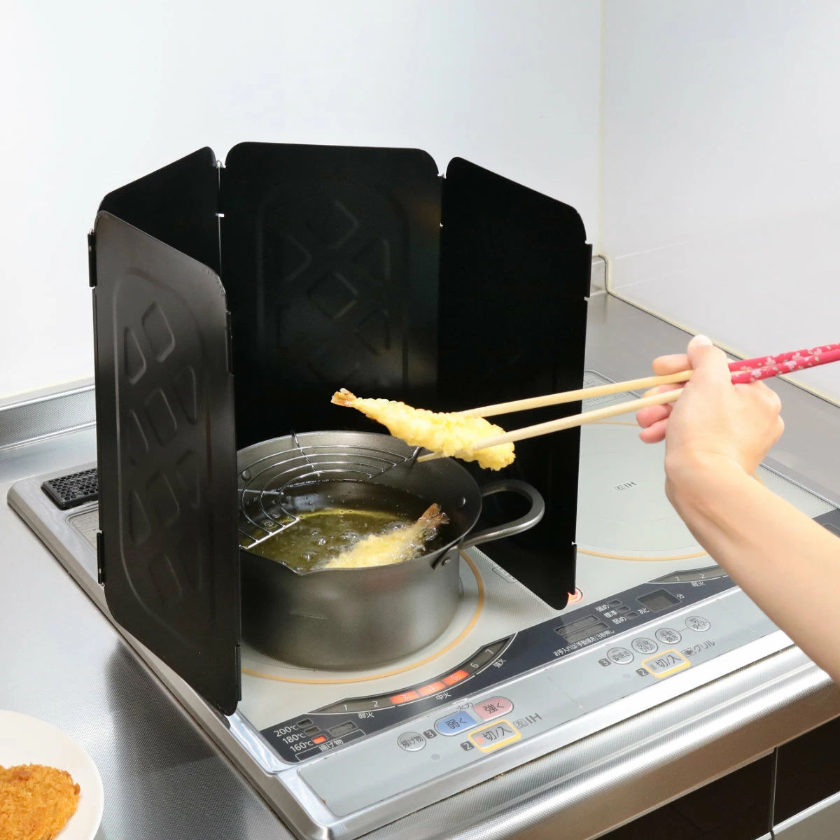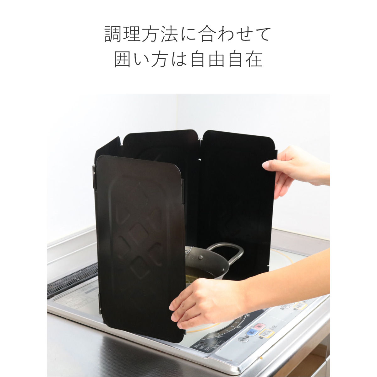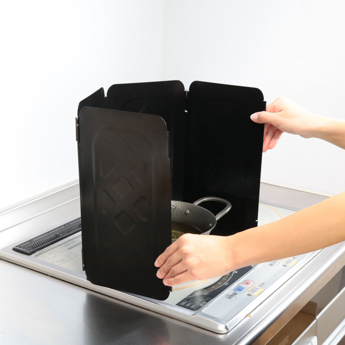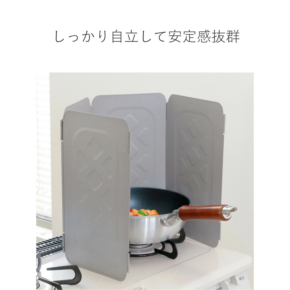 油はねが気になる調理時に、フライパンや鍋のそばに立てるだけで設置完了。コンロやIH、鍋のサイズを気にせず使えます。適度な重みがあるため、自立して安定感も抜群です。