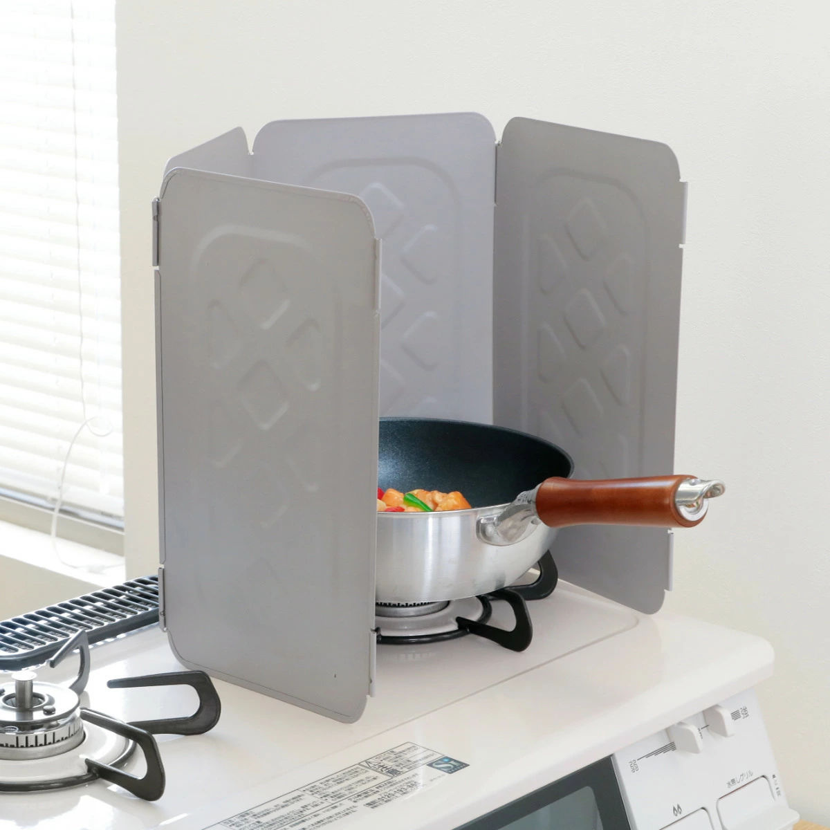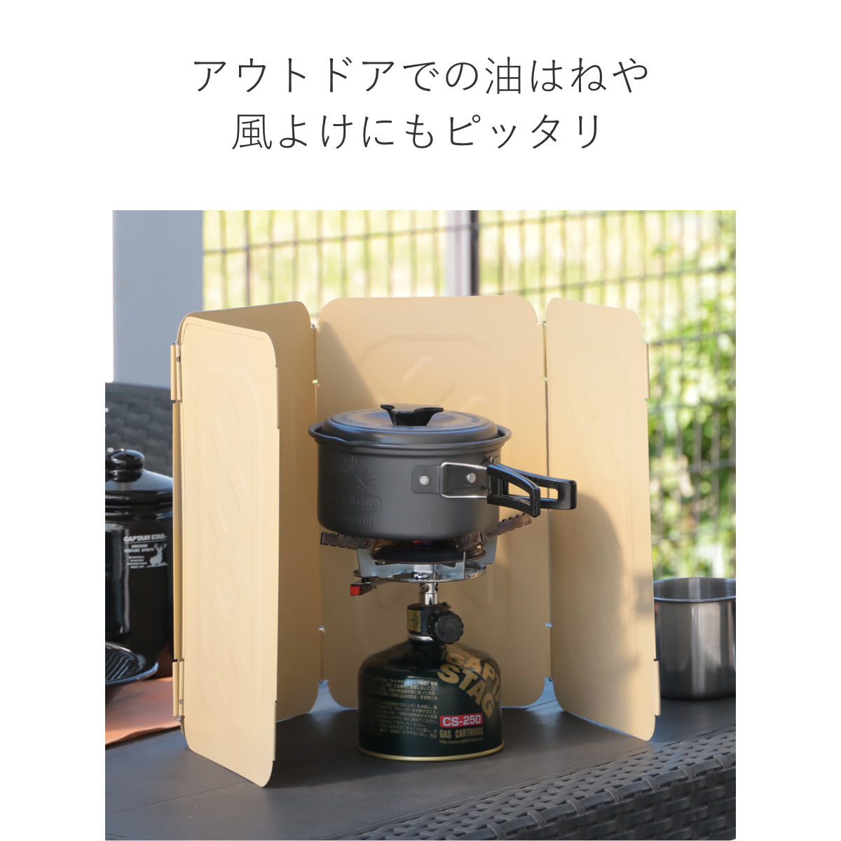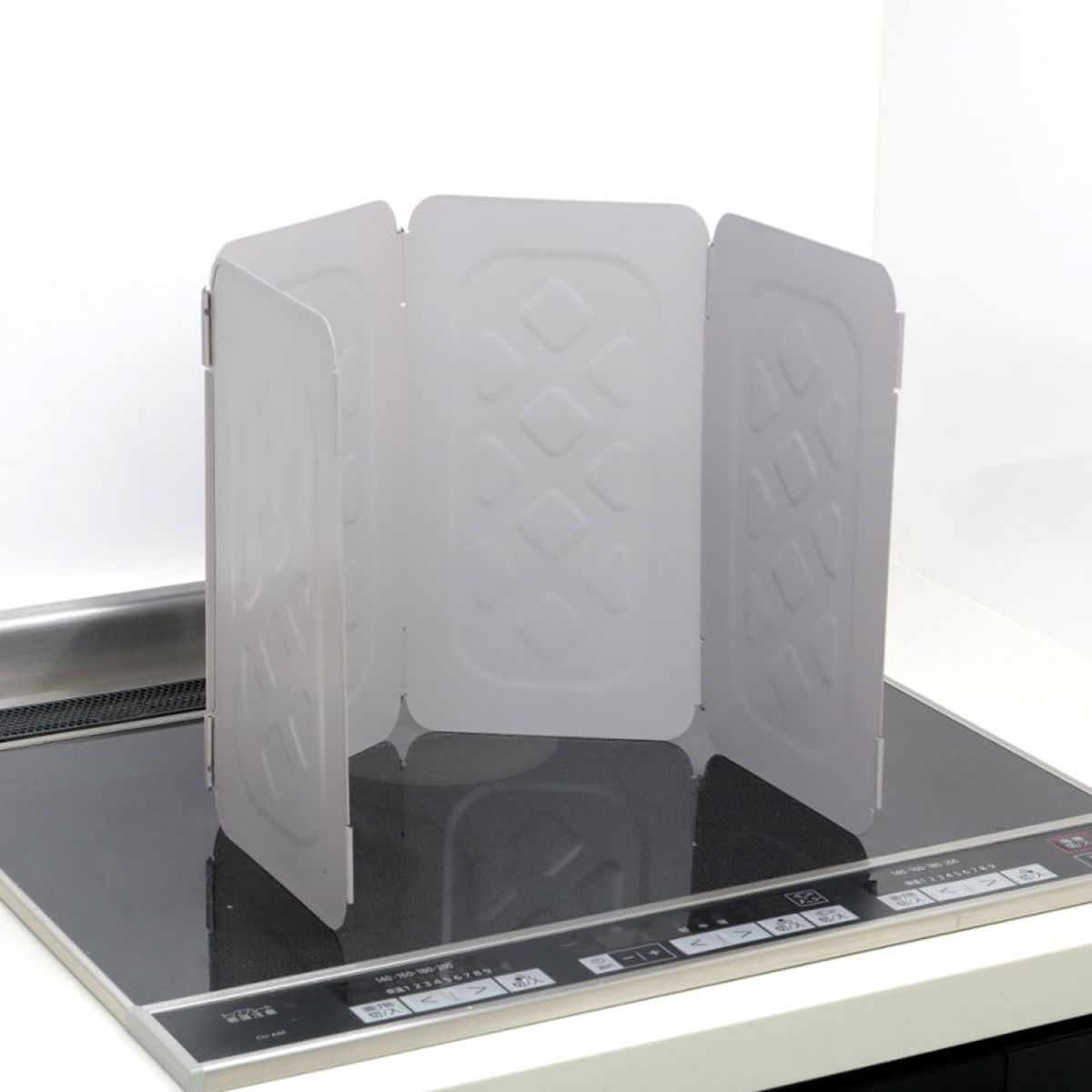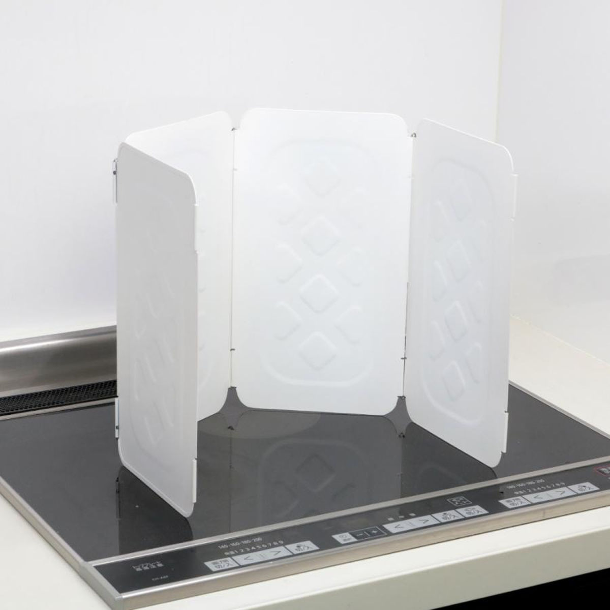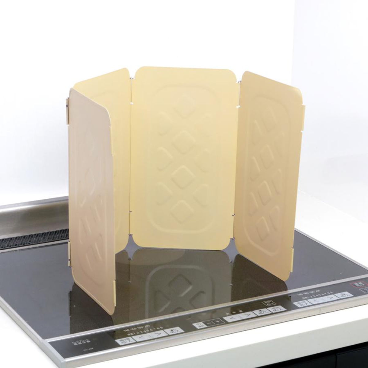油はねが気になる調理時に、フライパンや鍋のそばに立てるだけで設置完了。コンロやIH、鍋のサイズを気にせず使えます。適度な重みがあるため、自立して安定感も抜群です。