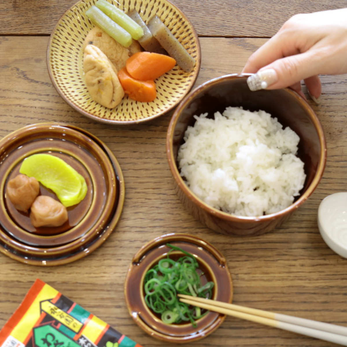 同シリーズのおひつの窪みに箸置き小皿をスタッキングできる設計で、おひつと共にスタッキングしたまま冷蔵庫に入れて、食べる時にセットすると簡単にテーブルコーディネートが完成します。