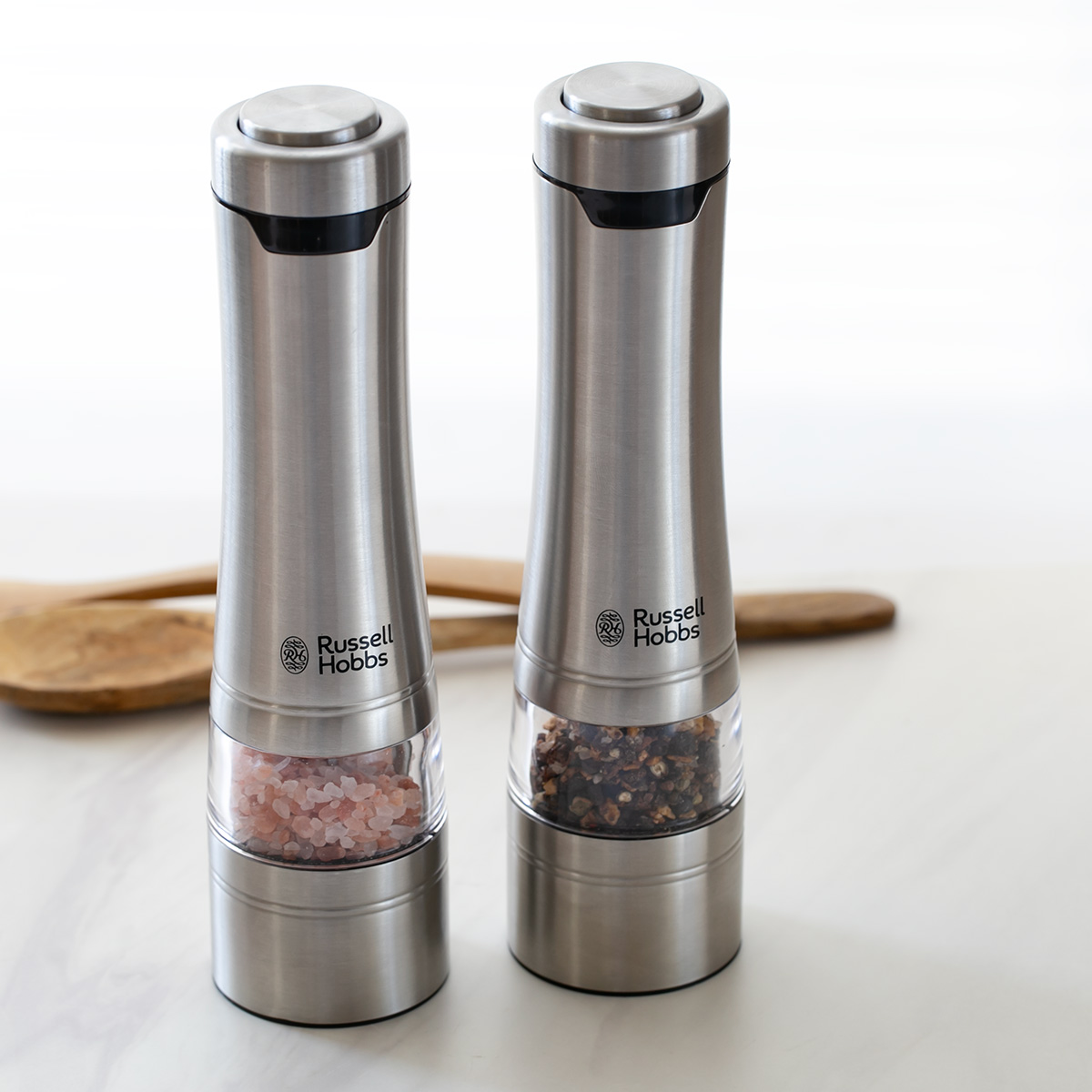 Russell Hobbs 電動ミル 2本セット ソルト&ペッパーミル ( ラッセルホブス ミル 2個 LEDライト付き 電池式 ボタン式 ソルトミル ペッパーミル ワンプッシュ セラミック刃 スタンド付き 胡椒 岩塩 香辛料 )