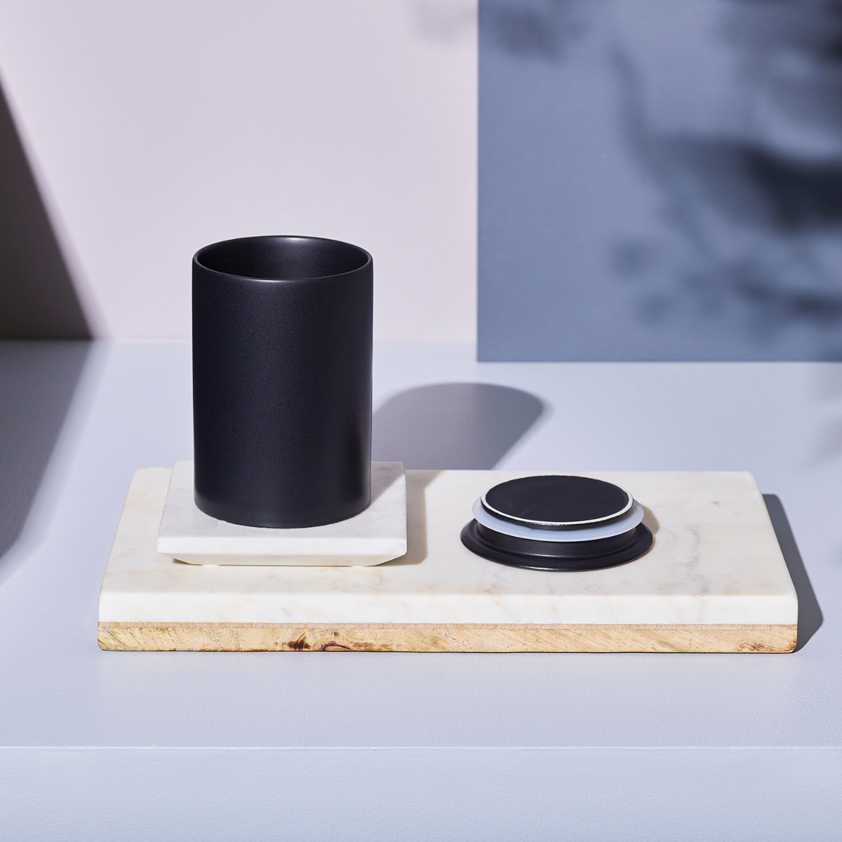 フタと本体には同じ素材が用いられ、シンプルで直線的なフォルムに作られています。温かみのあるなめらかな質感で落ち着きがありつつも、ずっしりとした重量感で程よい存在感もあり、飽きのこない佇まいに仕上がっています。