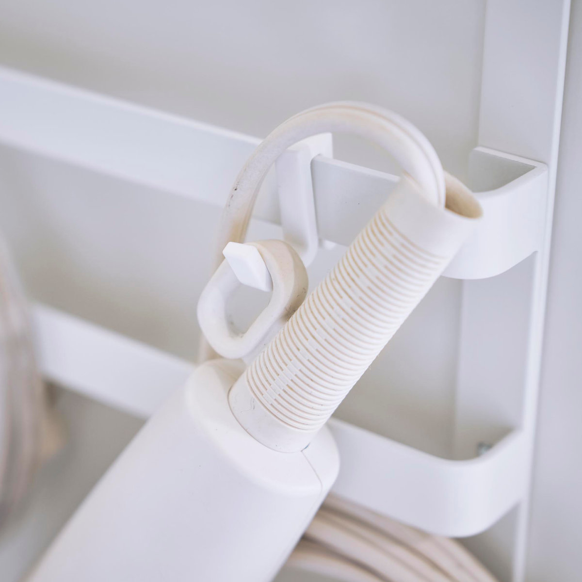 洗面所で置き場所に困るヘアケア用品もフックに掛けてスッキリ収納できます。