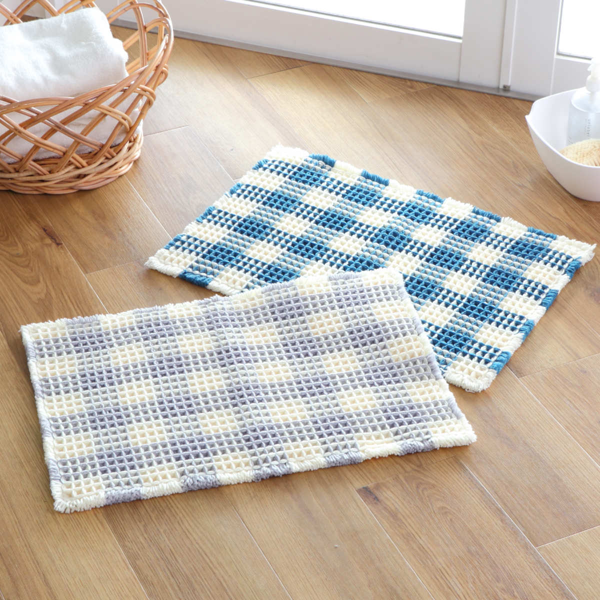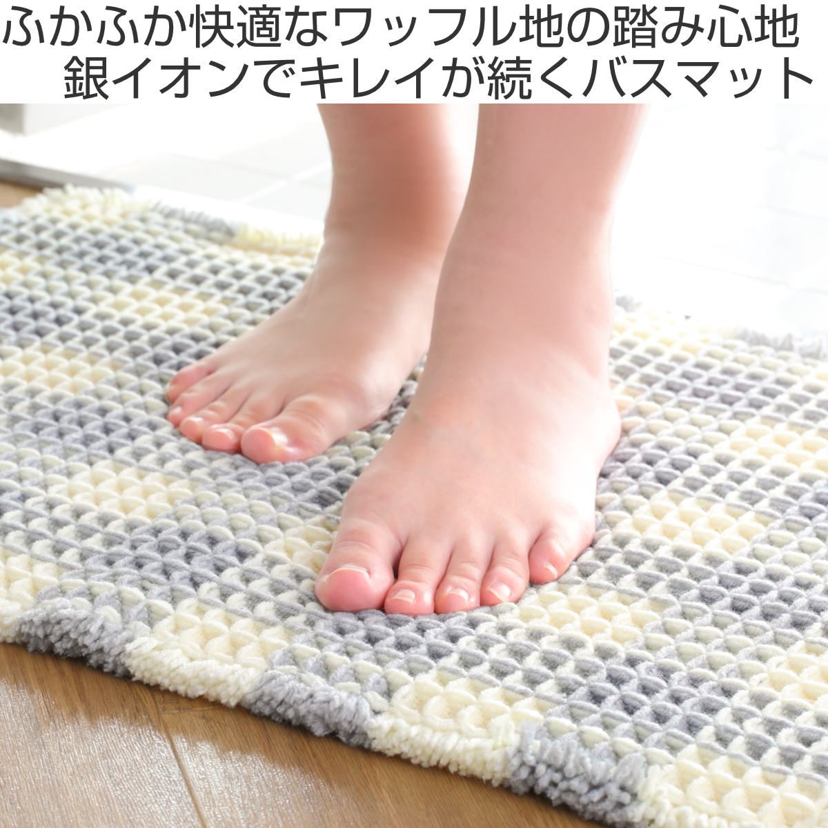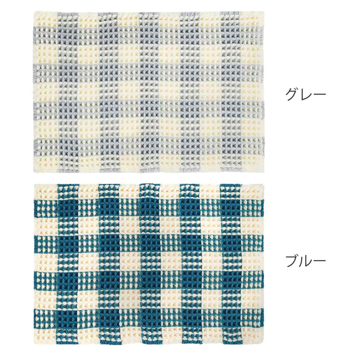 チェック模様がかわいらしい、ワッフル地のバスマットです。銀イオンの抗菌力・防臭・消臭加工付きで菌や臭いをブロックし、吸水効果も抜群です。お風呂上がりの足元を、いつでも清潔に保ちます。