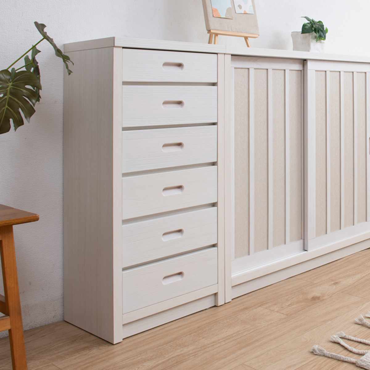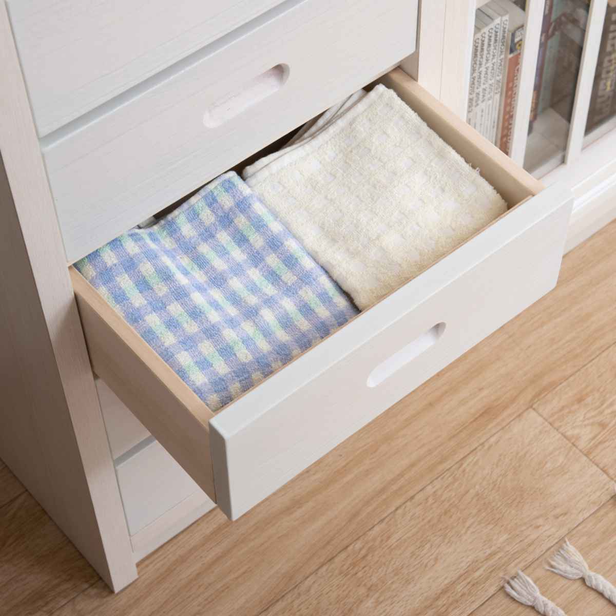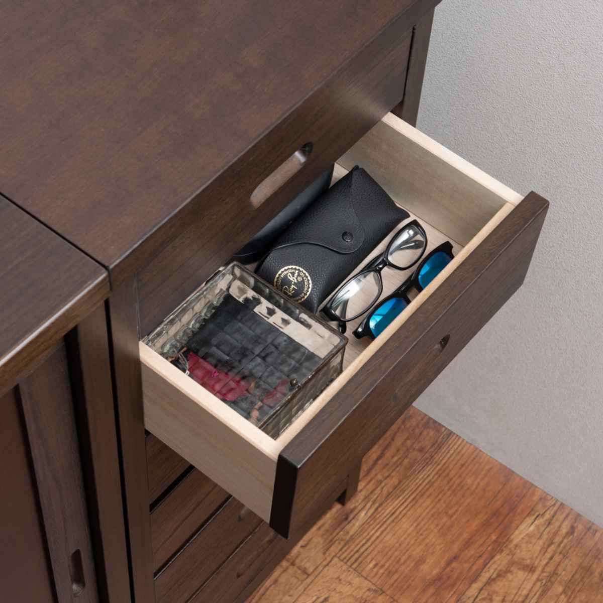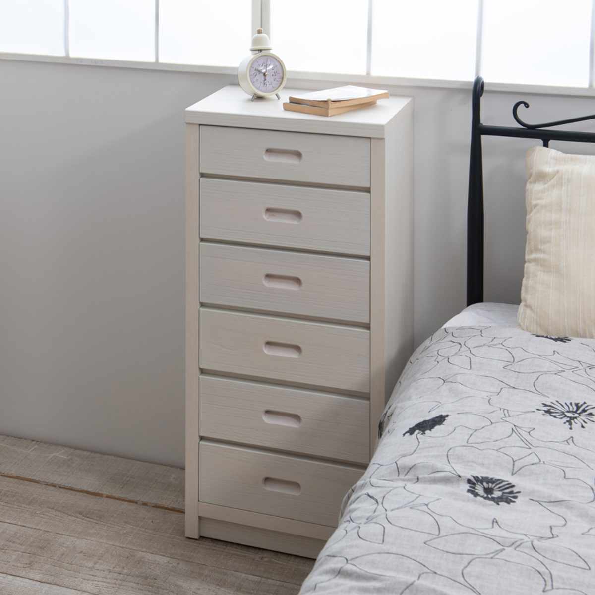 細かく分かれた6杯の引き出しが、色んな小物を小分けして整理できるので便利です。引き出しの転落を防ぐストッパー付きの仕様です。