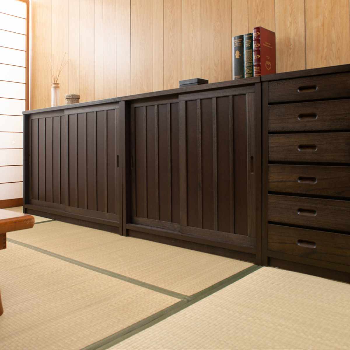 天然木桐材を扉の枠に使い、格子風デザインを施した和モダンなキャビネットです。天然木に凹凸感を出し、高級感漂う仕上げになっています。和の趣が感じられるキャビネットは和室・洋室ともによく馴染みます。