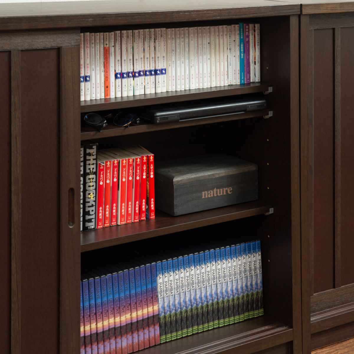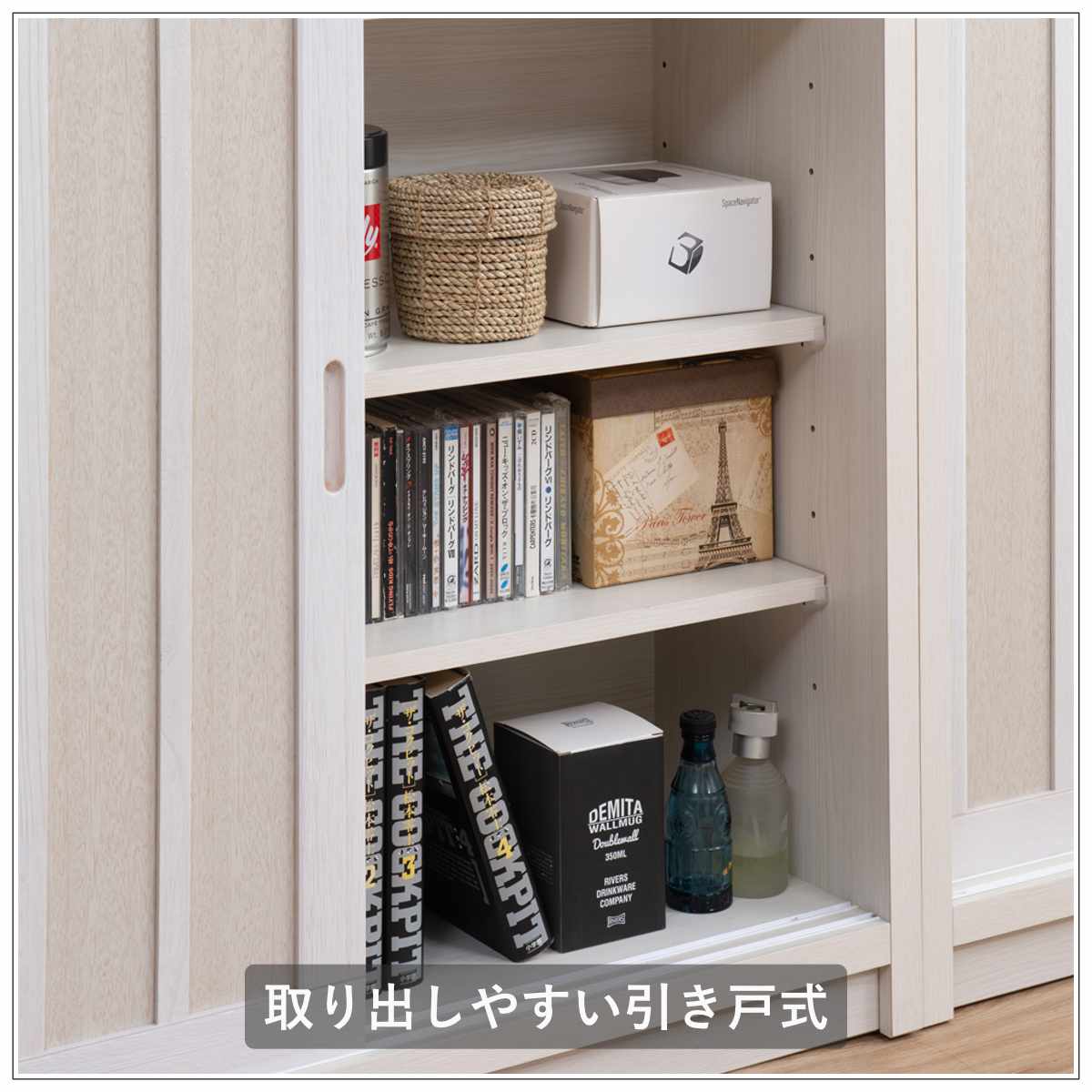 引き戸式のキャビネットなので、収納前のスペースが狭くなっても取り出しやすいです。CDやDVD、アルバムや眼鏡ケースなど小物収納にもぴったりです。