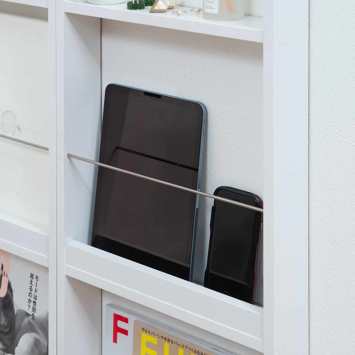 中段、下段のスペースには、雑誌や絵本などを飾りながら収納できるほか、薄型のルーターやタブレット、スリッパなどもキレイに片付けられます。