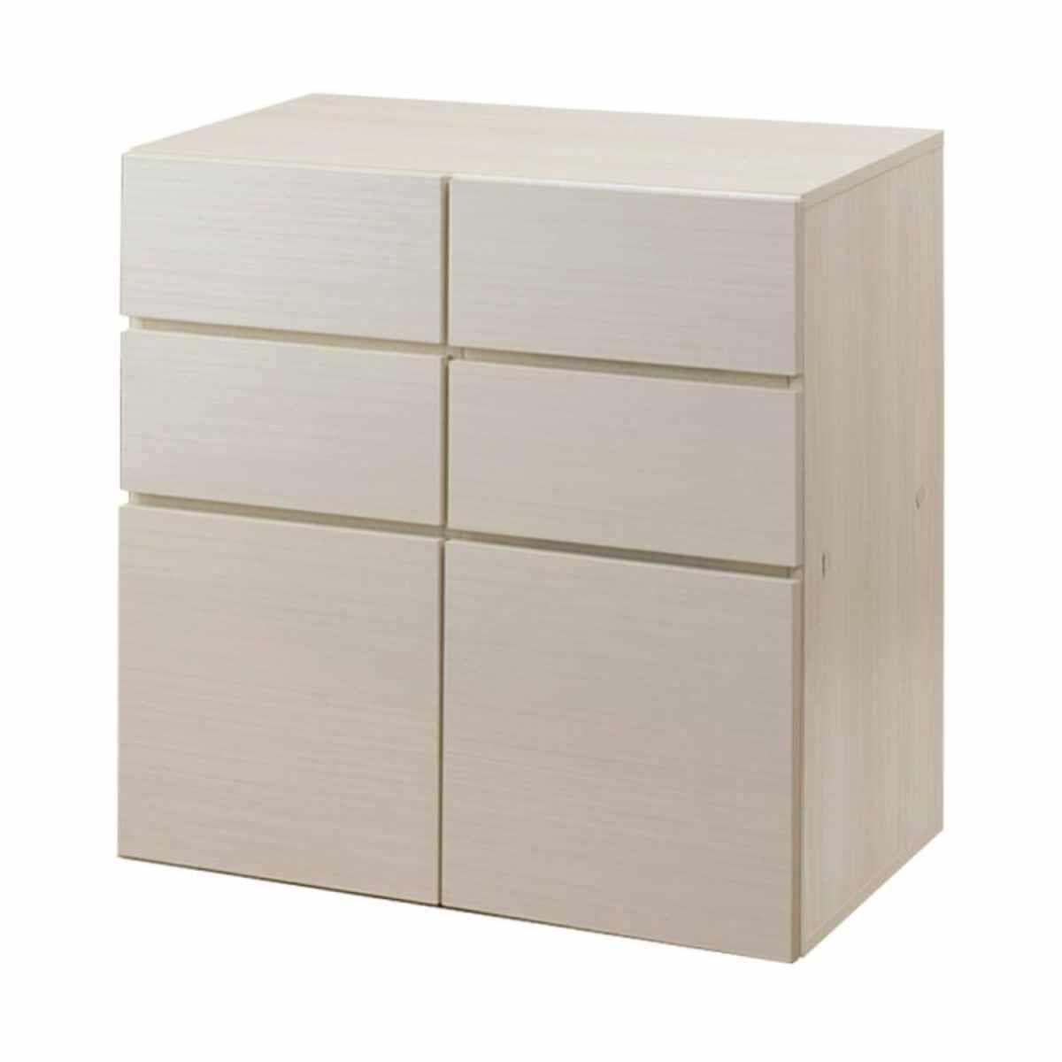 シンプルでコンパクトなデザインながらたっぷり収納できる「SANDY」シリーズのキャビネットです。上部に4杯の引出し、下部には2つに区切られた収納スペースがあるので、小物などをキレイに仕分けられ、整理整頓がしやすいです。下部の収納部分は、A4サイズのファイルや書類もすっぽり収納することができます。
