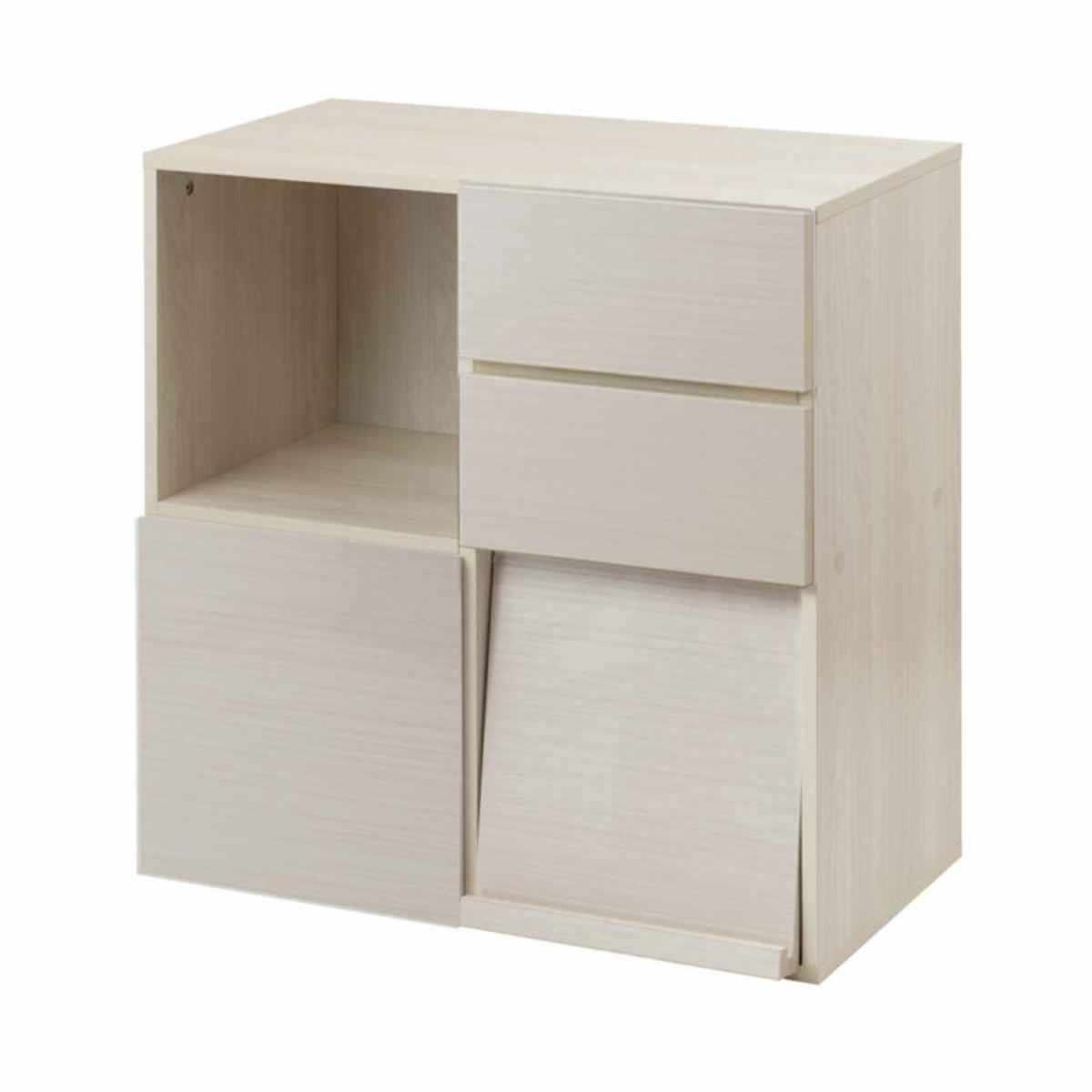 コンパクトながらたっぷり収納できる「SANDY」シリーズのキャビネットです。4つに区切られた収納部分はオープン収納、引出し、プッシュ式扉、フラップ扉と全てデザインが異なるので、楽しく収納することができます。