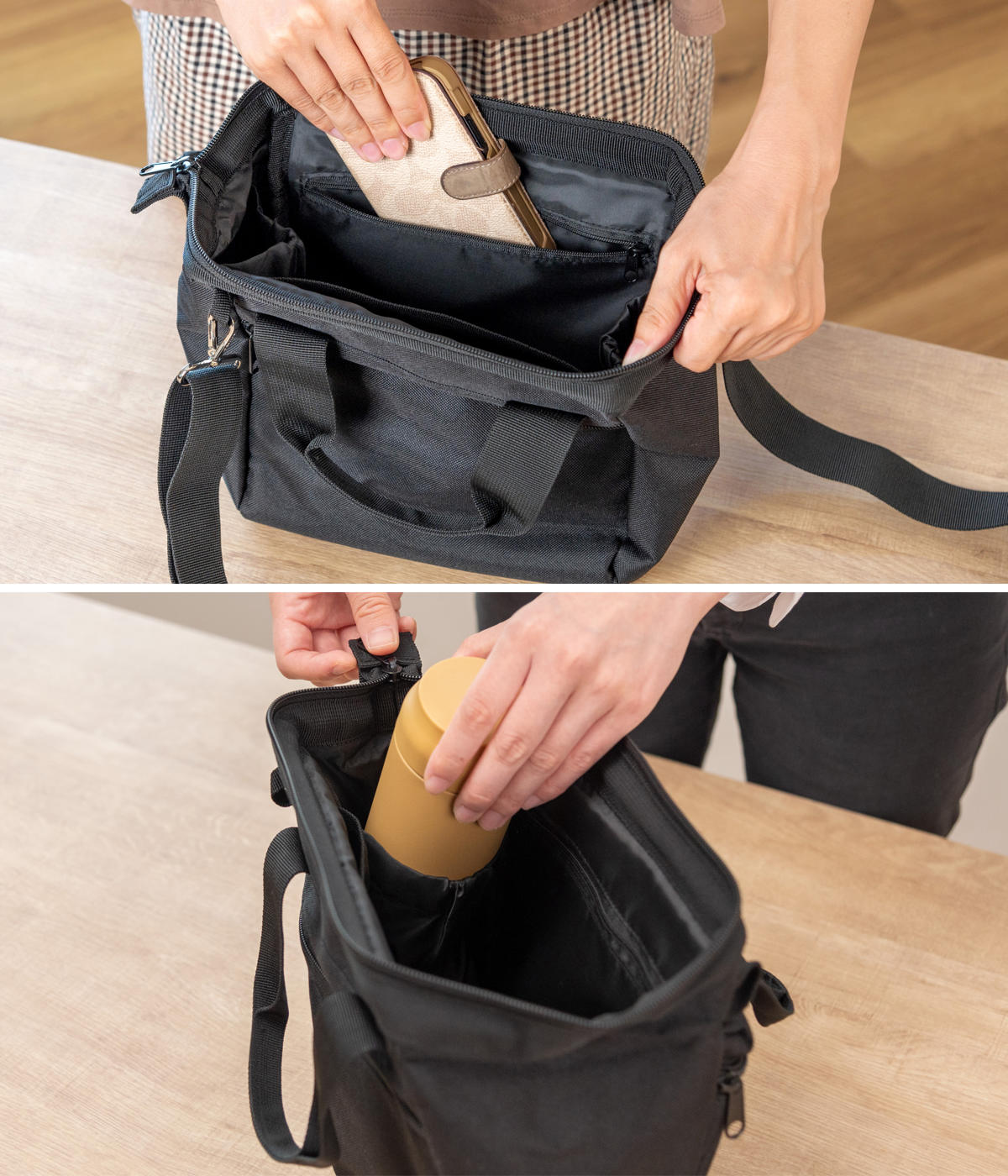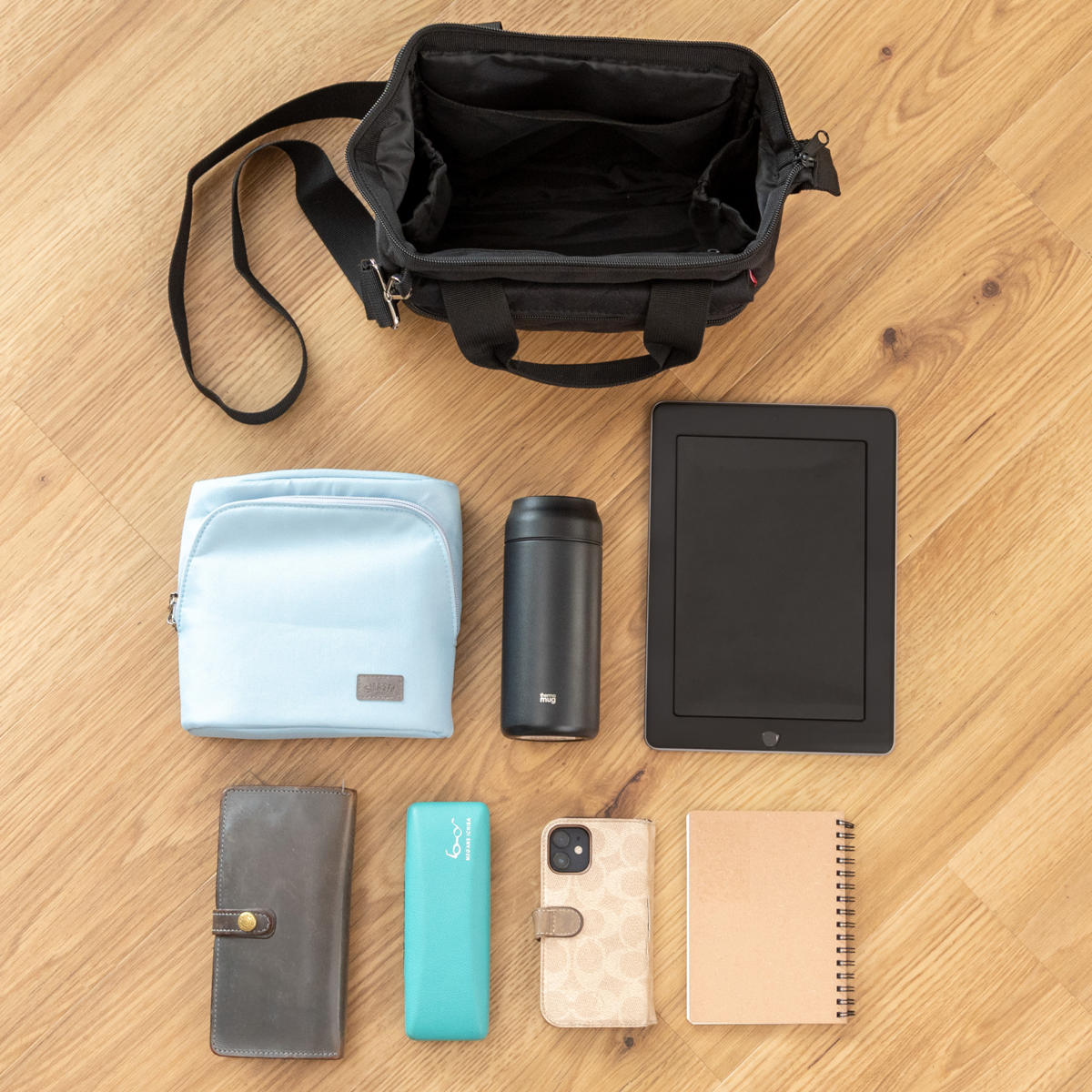 マチ13cmとしっかりと奥行があるので、財布やキーケース以外にも水筒・折りたたみ傘・お弁当箱なども入れることができます。コンパクトな見た目ながらも、収納力抜群です。